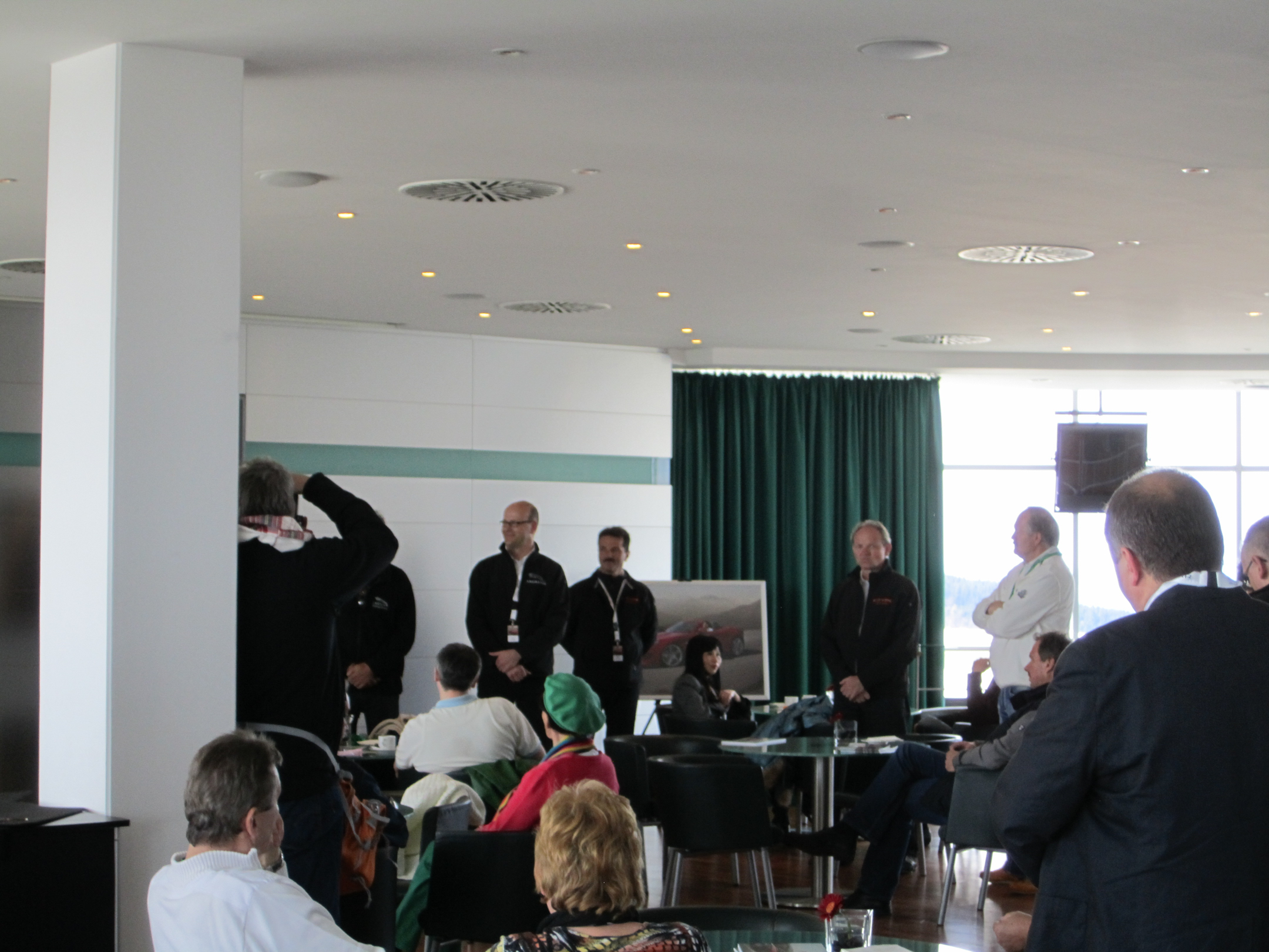 There was a large group of interested people present at the Jaguar box off the Nürburgring and after some snacks and refreshments a short presentation started about the F-Type. With the car selling it self there was no need for a commercial presentation so the presenters limited themselves to the technique and the pleasure of driving Jaguar’s latest baby.