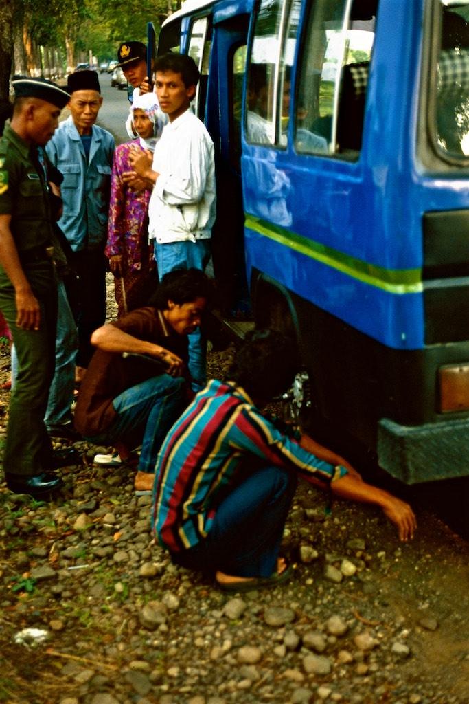 We strolled around for a couple of hours after which we went to the bus station and took a minibus to the Puncak pass. The drive was beautiful, tea-plantations wherever we could see. This was more like the indonesia we had expected. It was a fabulous experience. In Cianjur we had to swap busses, hardly anyone spoke English but a helpful student assisted us in finding some kind of transport to Bandung. Halfway there our ‘colt’ suffered from a flat tire but that was all part of the experience. Once in Bandung we found an acceptable place to stay, had dinner and went to bed early. It was only 9 o’clock but we were full of impressions and totally exhausted.