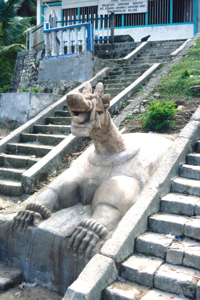I met Marrigje and Joost, two people from Amsterdam, who gave me good tips for visiting villages in the area. The first village which I visited was Bawamataluo (sun mountain). This was the biggest and most spectacular traditional village in South Nias. Before I was in the village I had to climb large stone stairs. On the sides there were two stone demons. The village itself was impressive indeed. Two rows of large houses were divided by a broad paved street. In front of the houses some gigantic megaliths were set-up. Both the houses and the megaliths were full of symbols which reminded of old times and rituals.