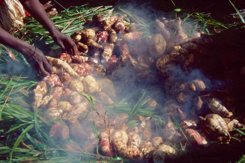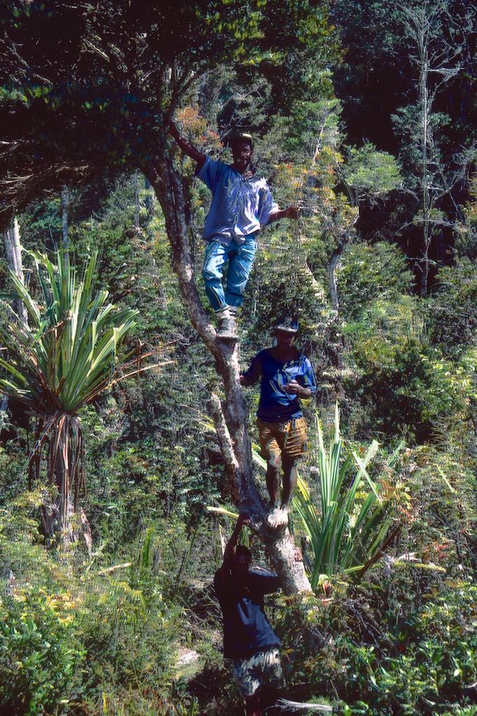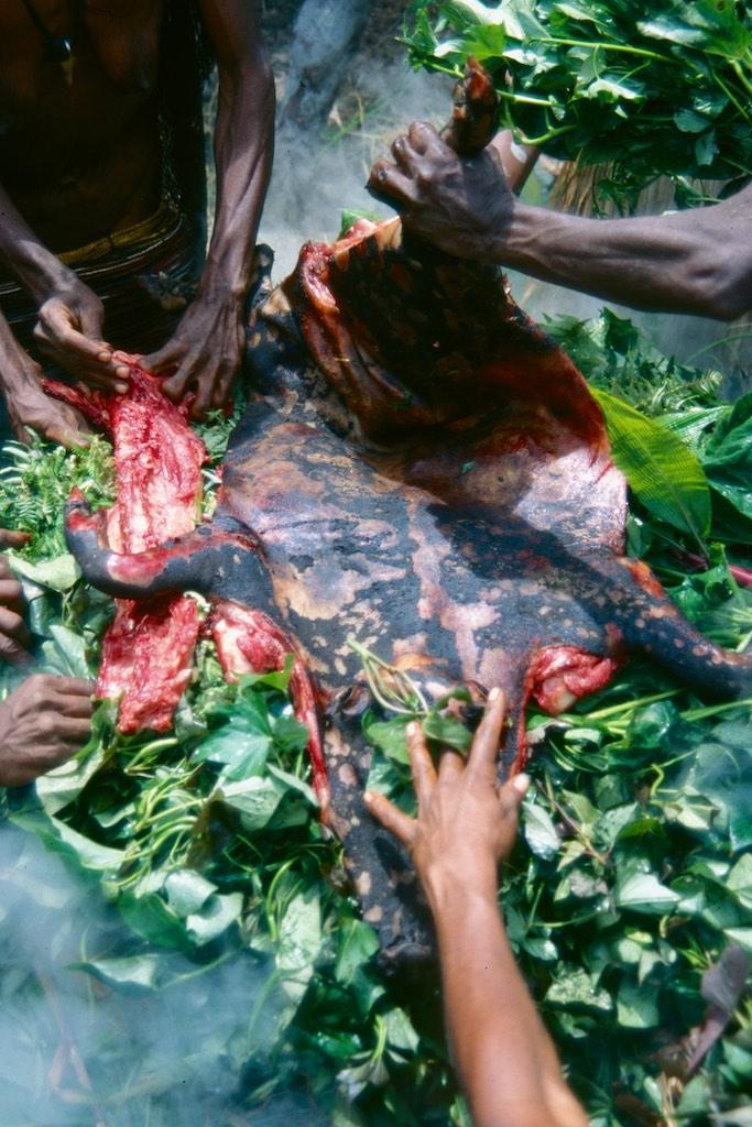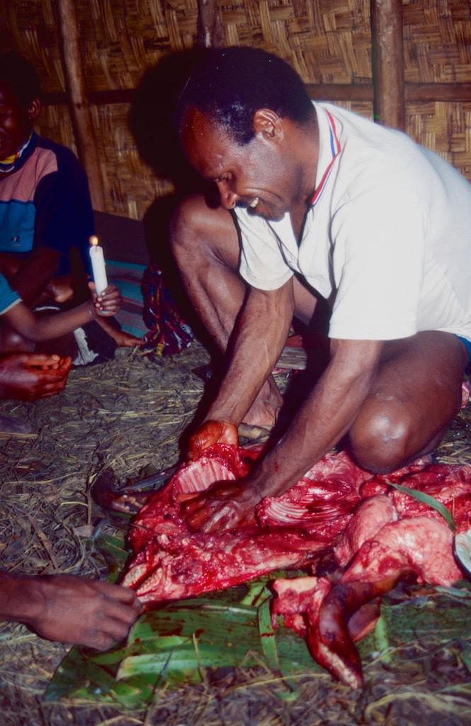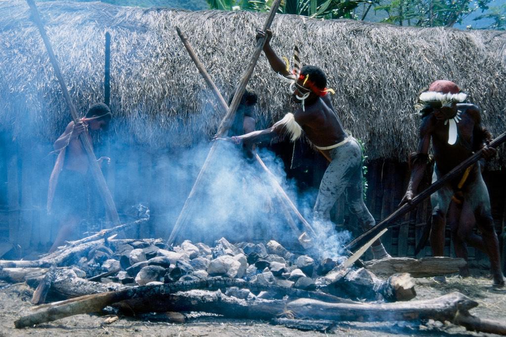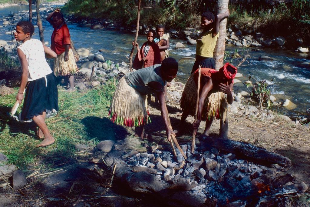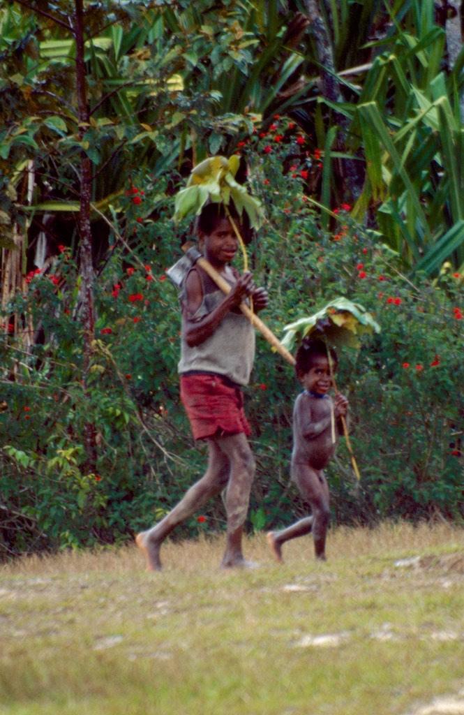 On the riverbank we witnessed the preparation of a traditional meal. A large whole was digged in the ground and partially filled up with hot stones which were heated on top of a large fire. On top of the stones grass was put before vegetables and sweet potatoes were added. Finally grass and more hot stones were added and this stone oven was left alone for some hours. In the mean time a large social event took place and everybody appeared to have a good time. In the evening half of the village gathered in our house and started singing and dancing. It was magic. The singing was very monotone and had a hypnotic affect on me. I fell in a deep sleep while I was still conscious about my surroundings and what was going on. When I woke up a bit later I found out that the singing and dancing hadn’t stopped yet. The head of the village was staring at me and we started to talk. I was happy I still was able to do a simple conversation in Indonesian, I hadn’t forgotten it all.