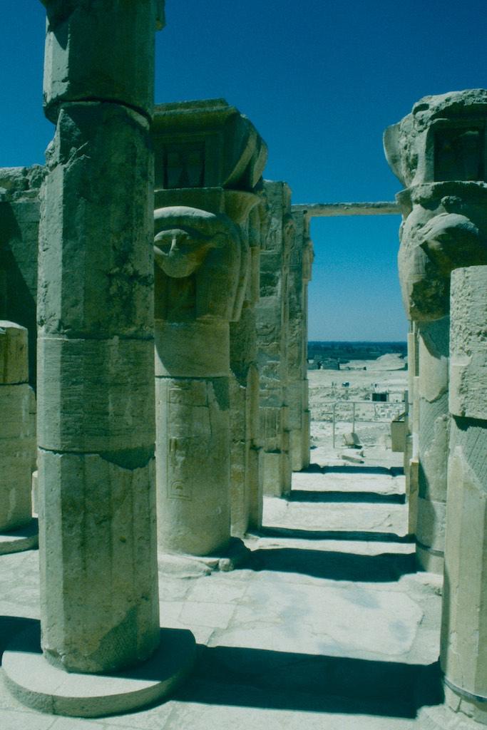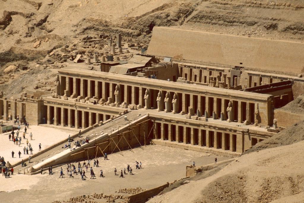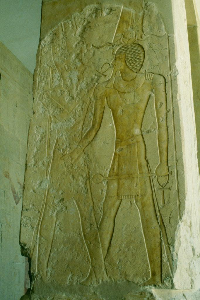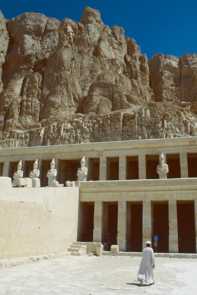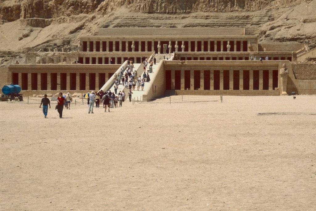 Our final stop for the day was the mortuary temple of Queen Hatshepsut, which we saw earlier that day when passing by on the cliffs above. It is an incomparable monument of ancient Egypt but also the site of the massacre where 62 people were killed by extremists in November 1997. Now two and a half year later no remains of that attack were to be seen so we tried to focus on the beauty of the site itself. Originally the temple had three levels of which two have been carefully restorated. At the time of our visit the top level was still under reconstruction so we could not go there.