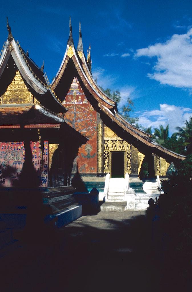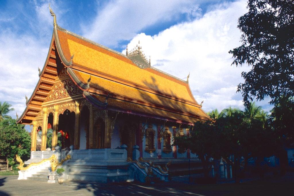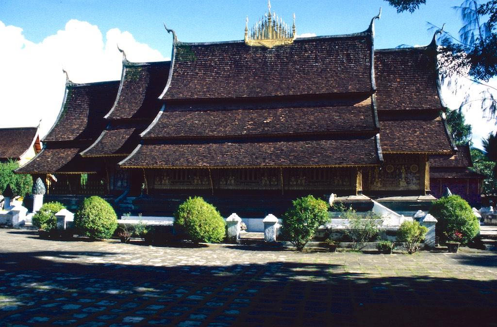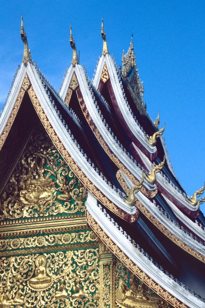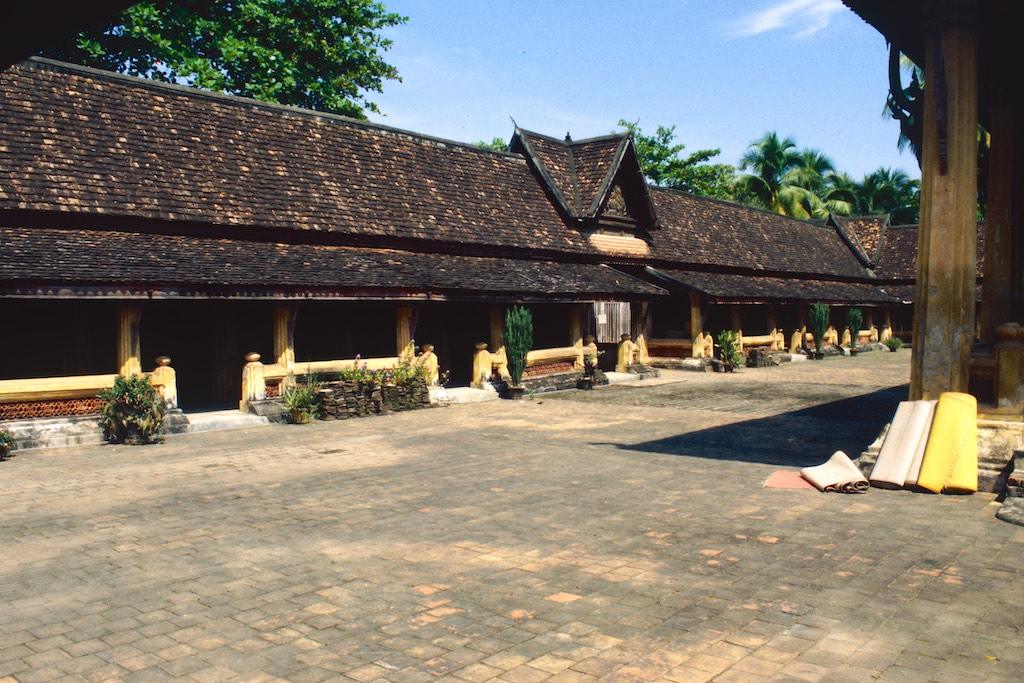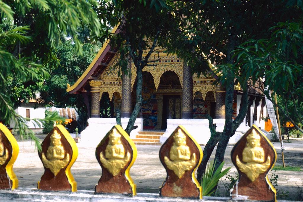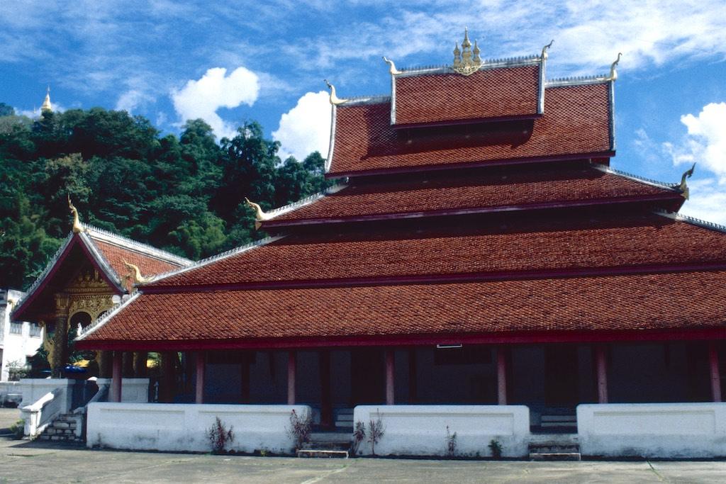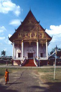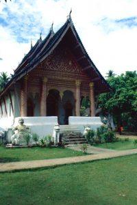The next day we took a bus to Luang Prabang, which took us over 8 hours. Not a boring trip at all as the landscape we traveled through was of an almost unearthly beauty. Rice fields, small villages and every now and then we had a glimpse of the Mekong. The mountains were absolutely stunning. Somewhere in the evening we arrived at our destination where we relaxed after the long trip. After a good night of sleep we were fresh again so we could start our exploration. The first temple we visited was Wat Aham Ontama Thany, a relatively small temple which once was the housing of the Sangkhalat. We continued our walk to Vat Visounnarath which was in the same neighborhood. It’s high peeked roof overhanging roof which sloped over the terrace was of an extreme beauty.