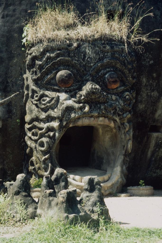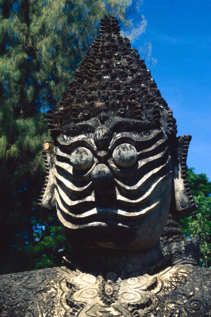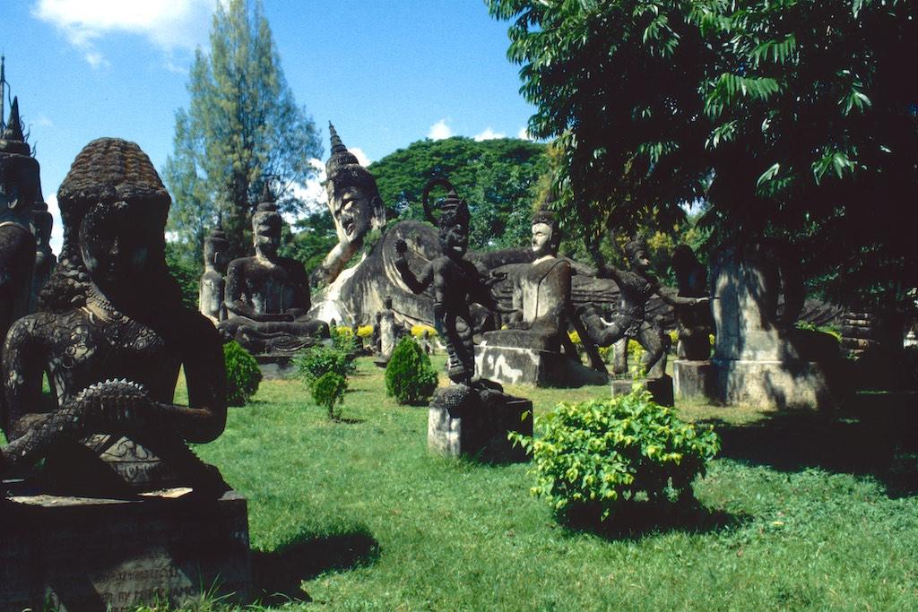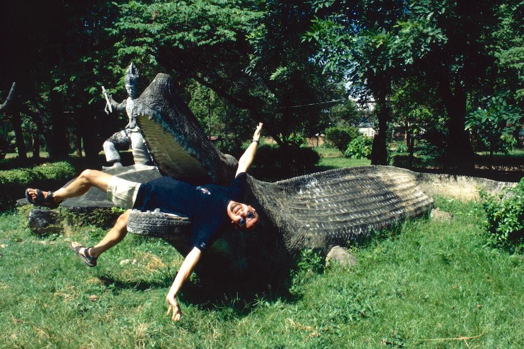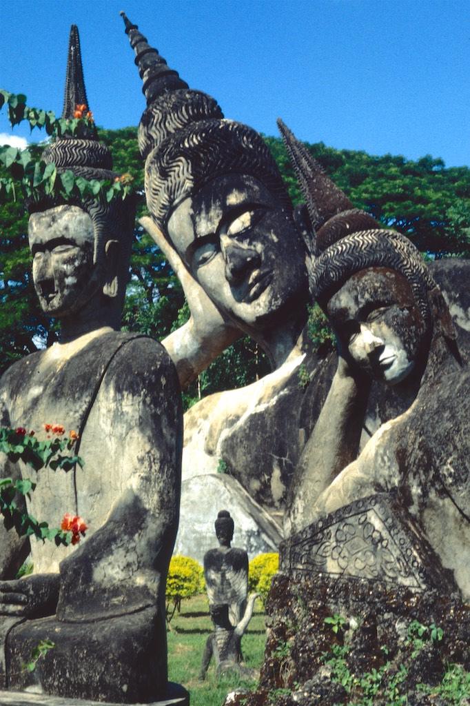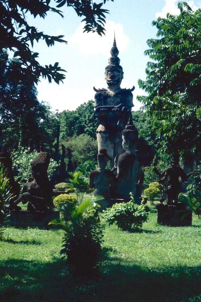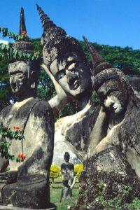 After we left our luggage in our guesthouse we took a motor trishaw to Xieng Khuan Buddha park, which was located 25 km southeast of Vientianne. In a rather kitschy environment a large collection of Buddhist and Hindu sculptures were gathered. Still we had a great time in this strange place. Back in Vientianne we saw the That Dam black stupa and spent the rest of the day shopping. We ended the day with another massage and an exquisite meal in “our” food garden (Now that was something we really needed after three days of fat fried rice in Phonsavanne).