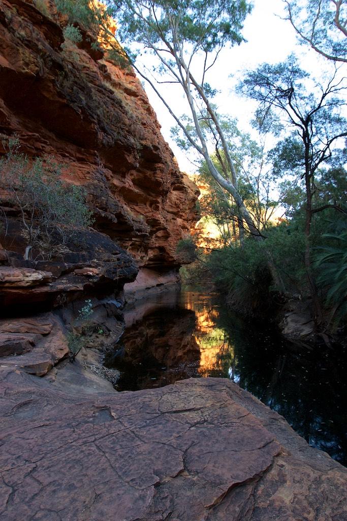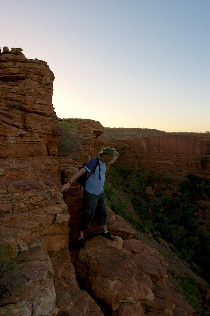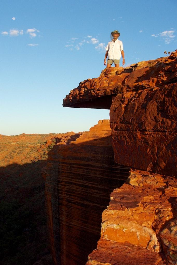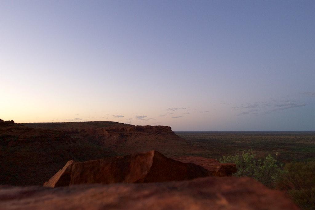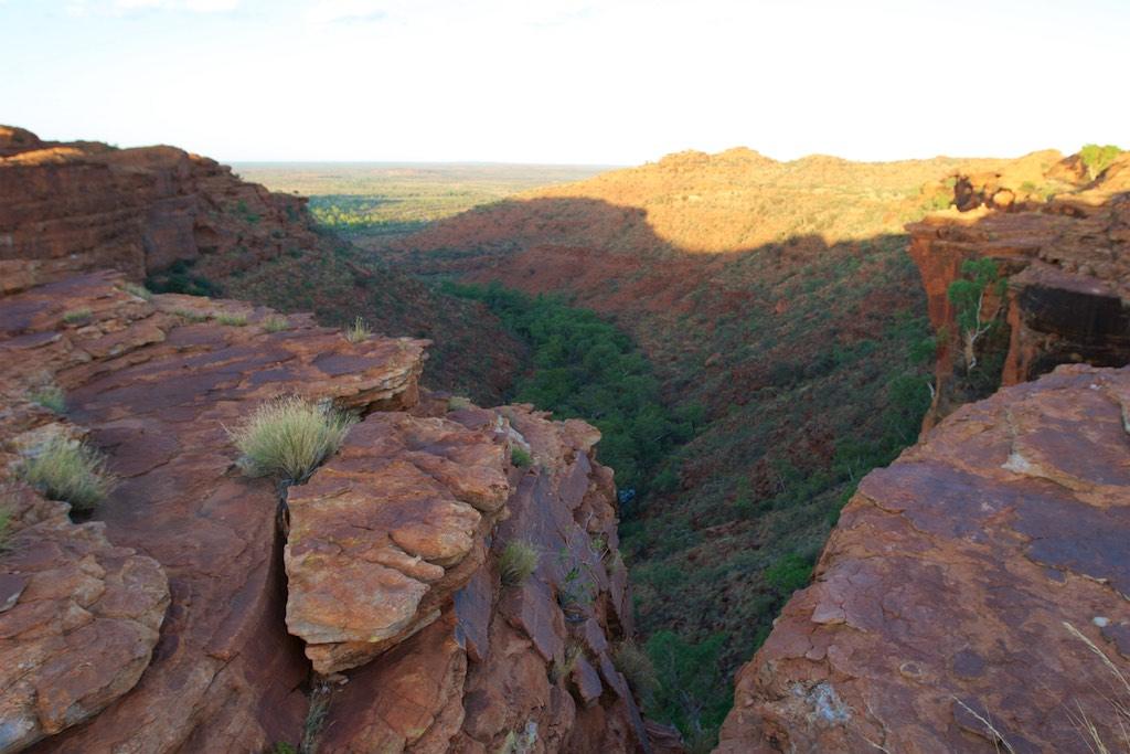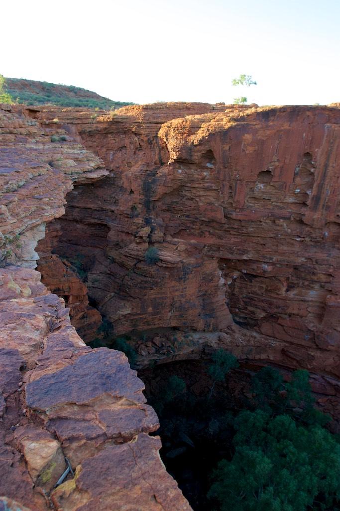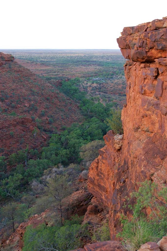 At the end of the afternoon we arrived at Kings Canyon resort, relaxed at the pool and enjoyed a nice dinner. Once again we went to bed early since we had to rise again at 5.15 (which is quite a regular on this trip). The next morning we drove off before sunset and climbed the steep ascend to the rim of Kings Canyon before the sun was up. This turned out to be a good idea, since it was ‘only’ 28 degrees at that time… The walk itself, well, what can I say, it was almost 4 hours long but the spectacular lookouts were worth every drop of sweat. Those of you who have been here will for sure know what I mean. It was a bit scary to sit on an overhanging piece of rock with over 100 meters below us the bottom of the canyon but we did it anyway and felt like we did something daring and special.