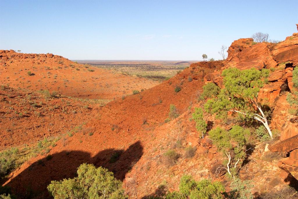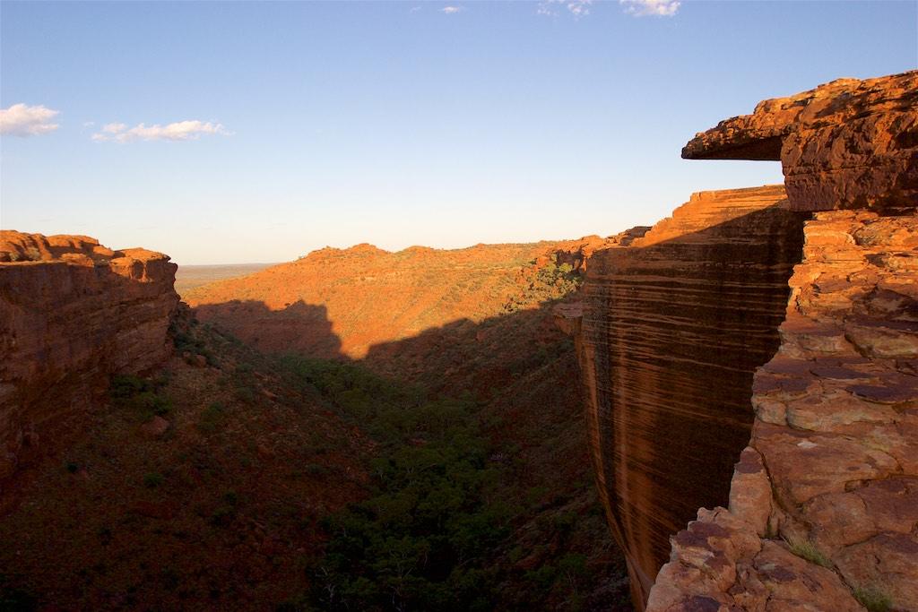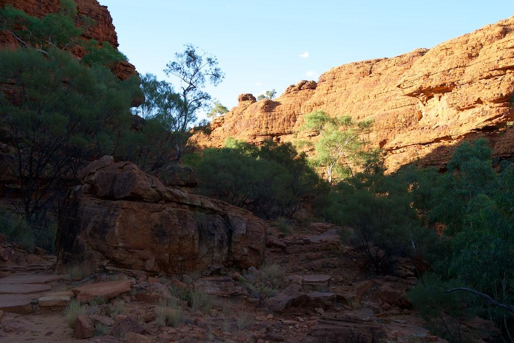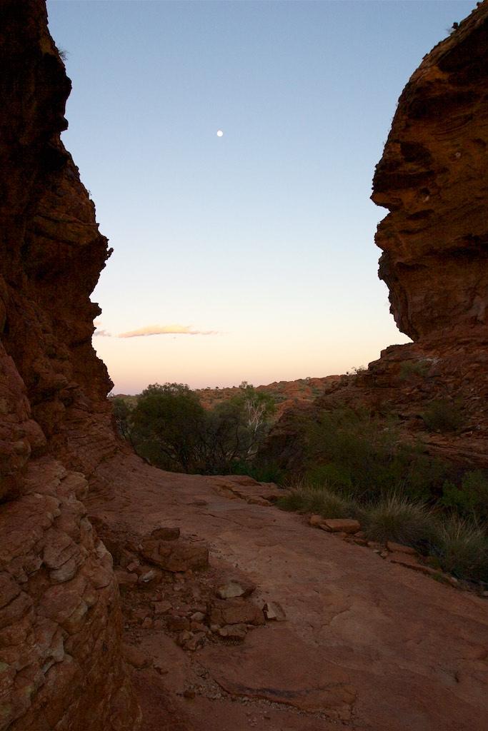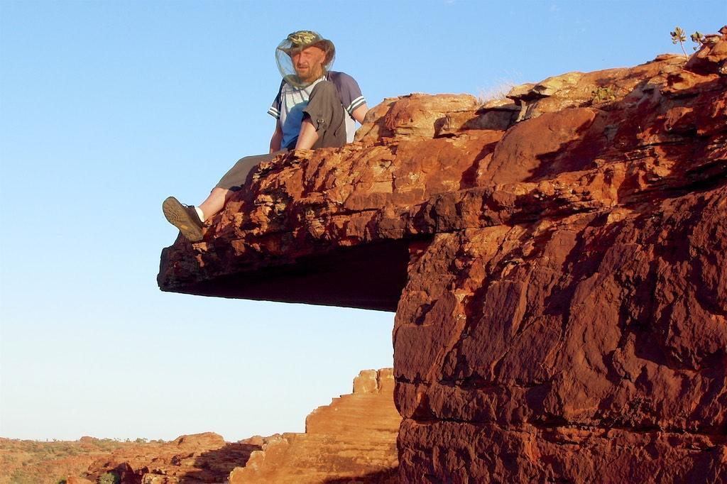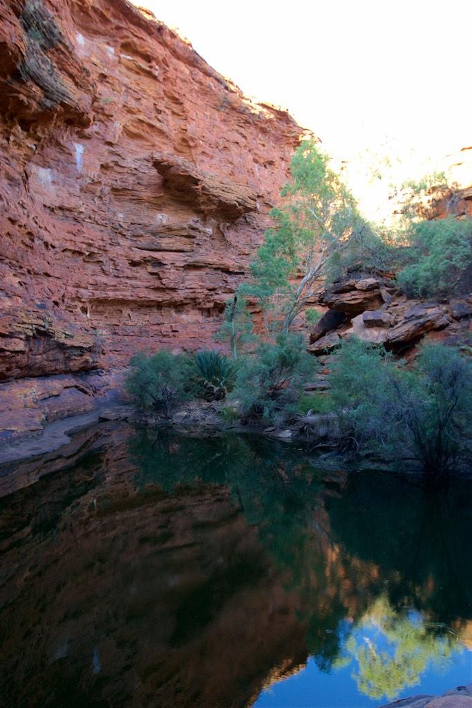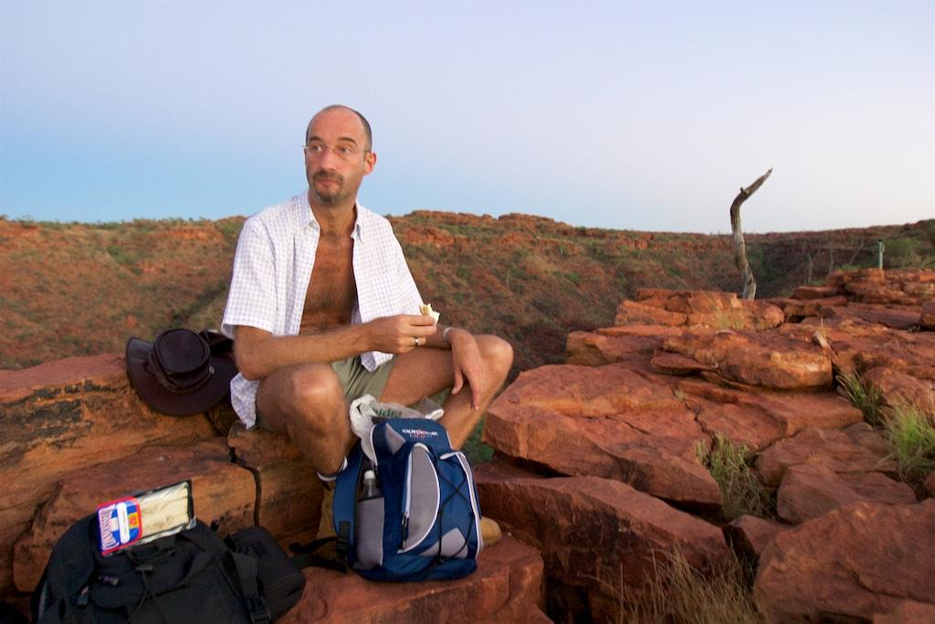At the end of the afternoon we arrived at Kings Canyon resort, relaxed at the pool and enjoyed a nice dinner. Once again we went to bed early since we had to rise again at 5.15 (which is quite a regular on this trip). The next morning we drove off before sunset and climbed the steep ascend to the rim of Kings Canyon before the sun was up. This turned out to be a good idea, since it was ‘only’ 28 degrees at that time… The walk itself, well, what can I say, it was almost 4 hours long but the spectacular lookouts were worth every drop of sweat. Those of you who have been here will for sure know what I mean. It was a bit scary to sit on an overhanging piece of rock with over 100 meters below us the bottom of the canyon but we did it anyway and felt like we did something daring and special.