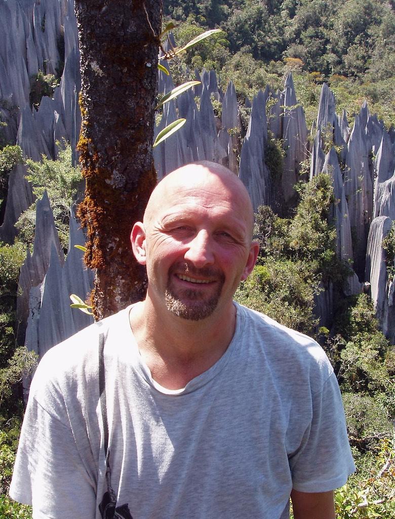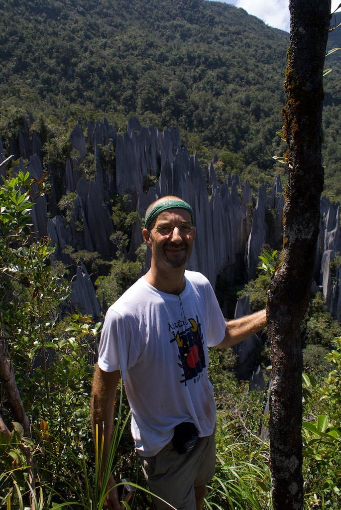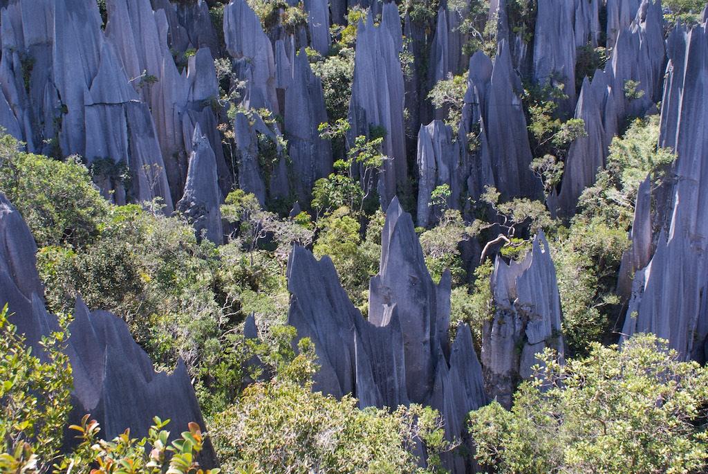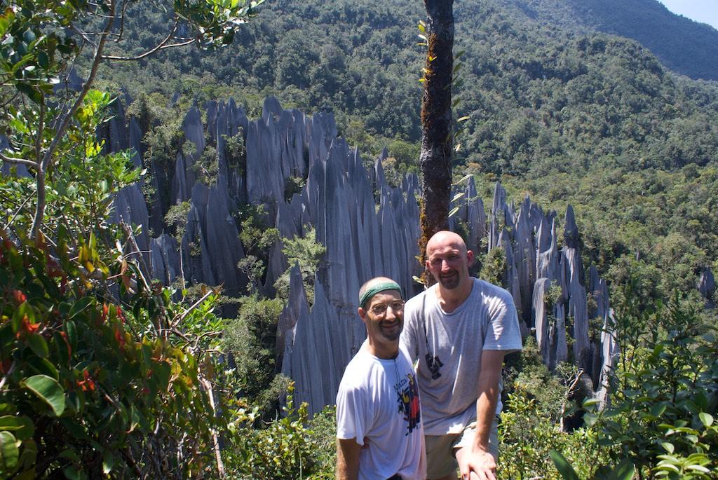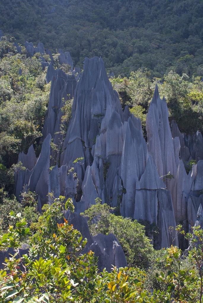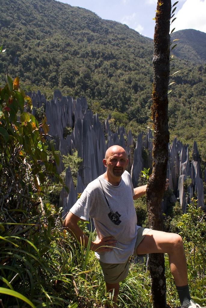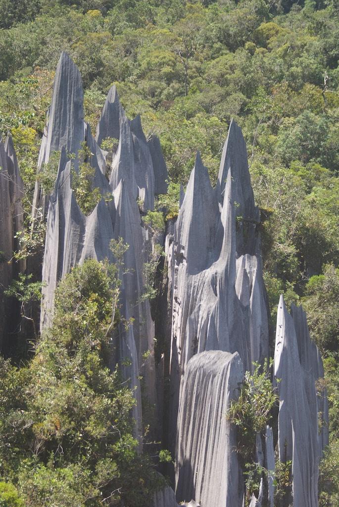 The grip was great but with the thin soles I felt every stone and root I stepped on. The stones were razor-sharp and there were some pretty dangerous situations. But believe it or not, we managed to reach the 2100 meter point before 11:00; otherwise we were not allowed to go further up the last 300 meters since it was impossible then to return before dark. 300 meters only, 16 Ladders, lots of ropes and some serious rock-climbing later we arrived at the top of Gunung Api (well, the lowest of the three peaks that was), exhausted, sweating like pigs but o so proud and happy the both of us achieved it without any damage. The reward, the pinnacles, were worth all the effort though! A forest of razor sharp cliffs rose high out of the surrounding trees, a spectacular phenomenon, absolutely stunning! We had our packed lunch over there and relaxed a bit.
