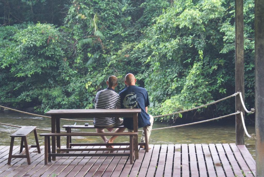 The next morning we had a bit of a sleep in. well sort of as the rest was extremely noisy and woke us up so we relaxed at the river, had a nice breakfast and started our 8 km walk back to the starting point. That walk was so incredibly easy compared to the day before that we did it without a single complaint 😉 A couple of minutes after we arrived at the start point of our hike the boat arrived and we headed back downstream towards the royal Mulu resort. We had found out it was Silvia’s birthday that day so we invited her for a drink at the resort. As it had rained so much there was no need to push the boat and about an hour later (we were going with the flow this time) we arrived. A quick check in later a hot shower was waiting for us. PURE LUXURY!!!!! We felt clean for the first time since a couple of days. Refreshed we went to the pool for some swimming, some absolutely nothing and some very well deserved beer.