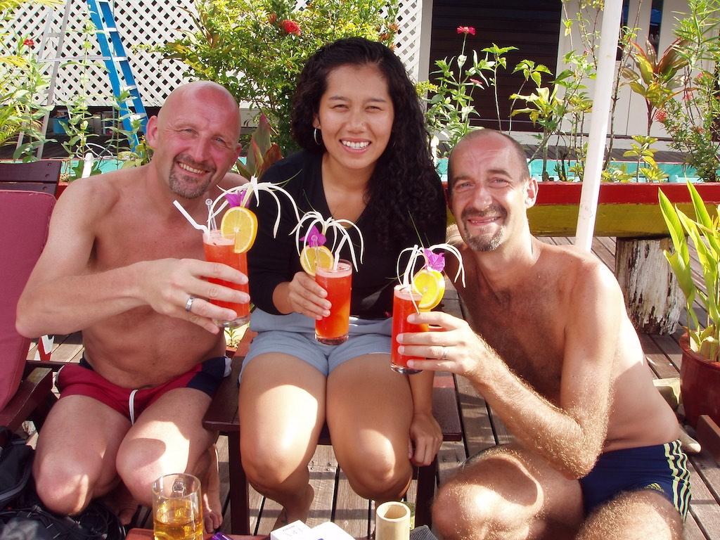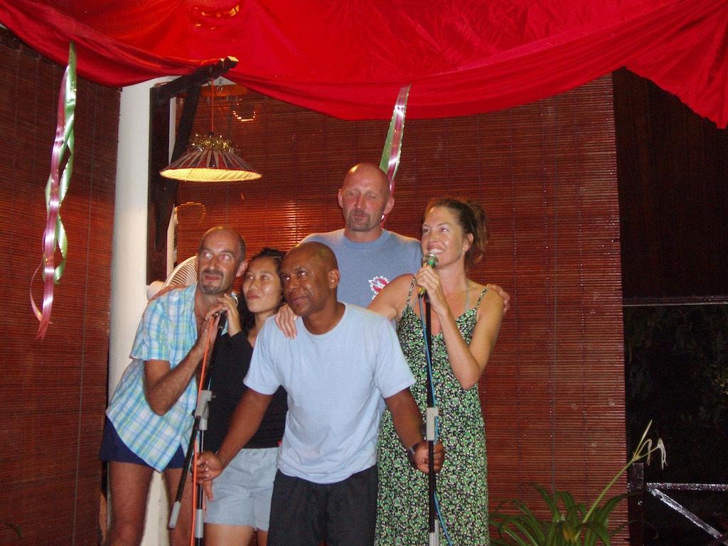 People who have been in Asia know the favorite time spending over there. It is called Karaoke… Well, it was fabulous as ever, especially with some extremely talented singers from Europe in the area. Yes we went onstage and sung beautifully from the bottom of our hearts for the birthday girl. We were so fantastic everybody clapped for us. Motivated by a couple of drinks later we even went onstage two more times… Paul did a solo but had trouble reading the words not wearing his glasses. It was hilarious. As it started off raining again we requested rain from Madonna to finish off the evening. Greg, Gerdie, Paul and I went on stage as “the bungle jungle singers” and did a perfect choir improvisation. I guess the only word in tune was ‘Rain’, the rest of the words we managed to sing totally out of sync and tune with the melody line. Everybody clapped again (guess they were glad we finally left the stage). It was a hilarious evening and we had so much fun, this is a one off though so don’t expect us to continue our career in this field, I do not think that would be a wise move.