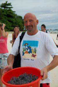Lankayan is not only a diving resort but it also houses an ecological center for turtle research and breeding. Every evening turtles come to shore to lay their eggs. Once done and the turtles returned to sea these eggs are collected and let to bread under safe circumstances so no birds or other predators can eat them. Once they come out they are collected again and released into the sea. Tonight was exactly one of those evenings. One small baby turtle had cracked through the sand that was the sign that more eggs must have popped. With a little help 158 small turtles surfaces and put in a big bucket. Once all were collected they were quickly brought to the beach where they were released. All had to be done very quickly otherwise the little animals would get to exhausted and would stand no chance to reach maturity. Out of every 1000 babies set free only one or two would reach that maturity. The workers at the conservation center always look for a place at the beach, which is free of black tip baby sharks that want to feast on the turtles.