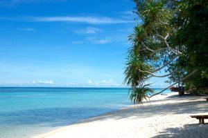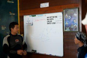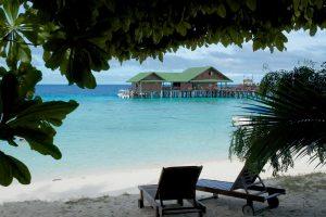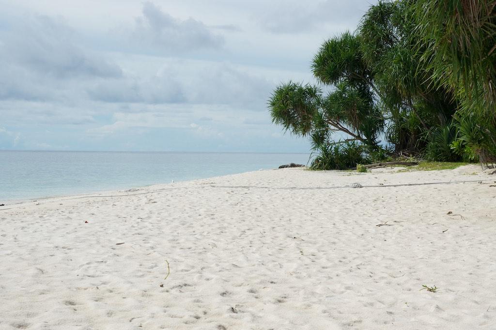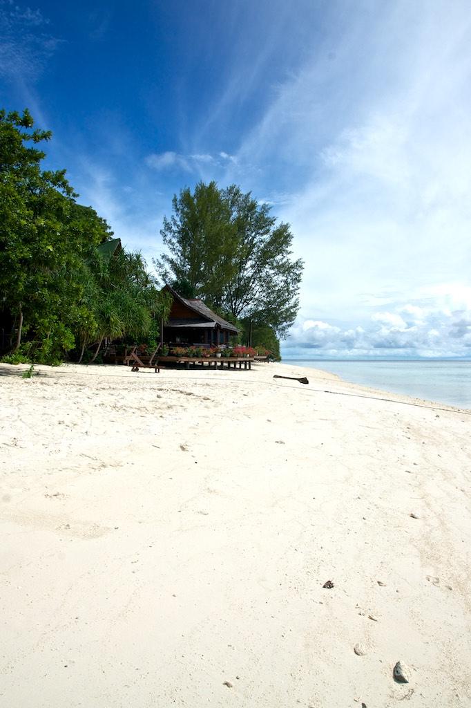 We even managed to do another ‘hike’ around the island; now the sun was shining it looked more beautiful than before. The sand was so white it almost hurt our eyes. The sea was emerald green, the sky bright blue with some clouds. Truly a paradise on earth! We shortly relaxed in front of our bungalow, enjoying the sound of the waves, after we went back to the dive center for our second dive of the day.