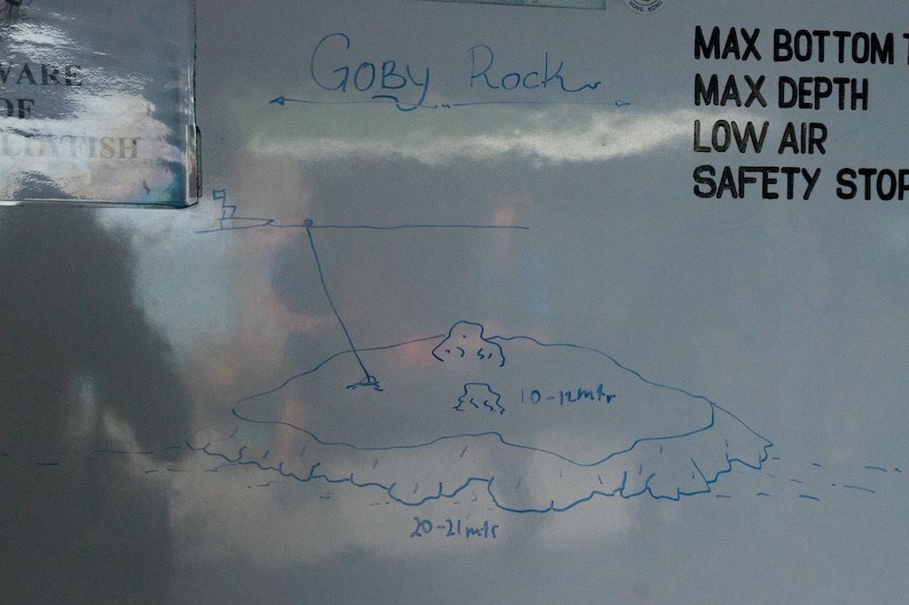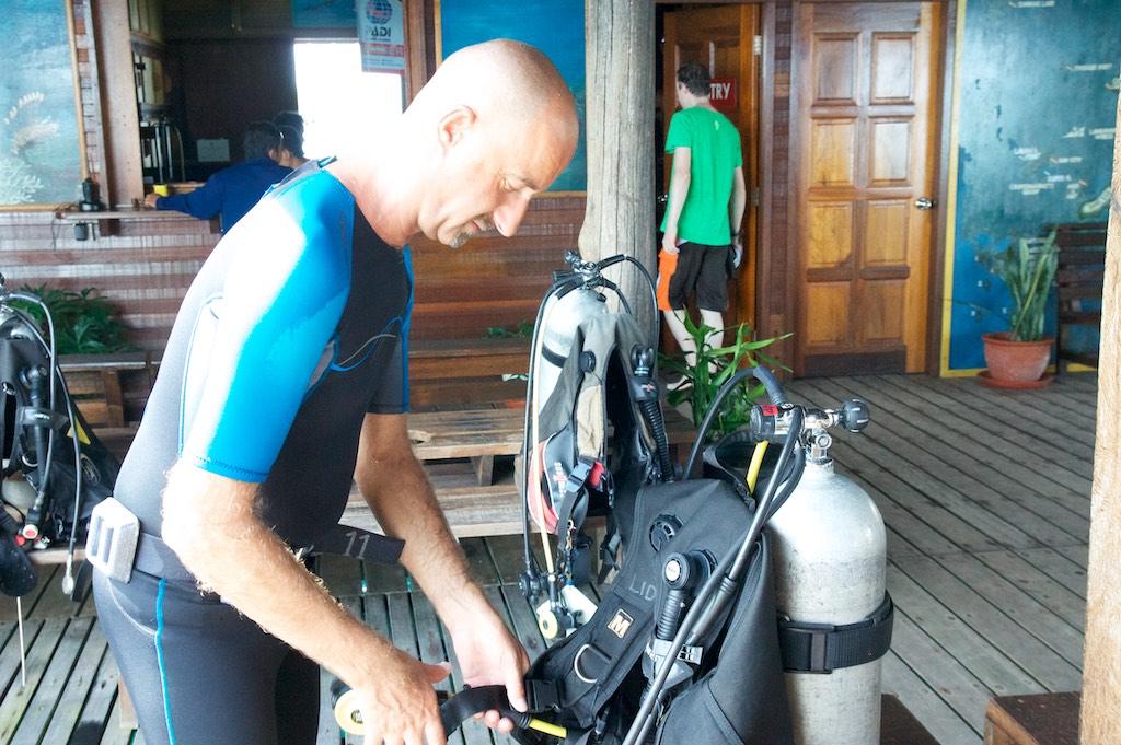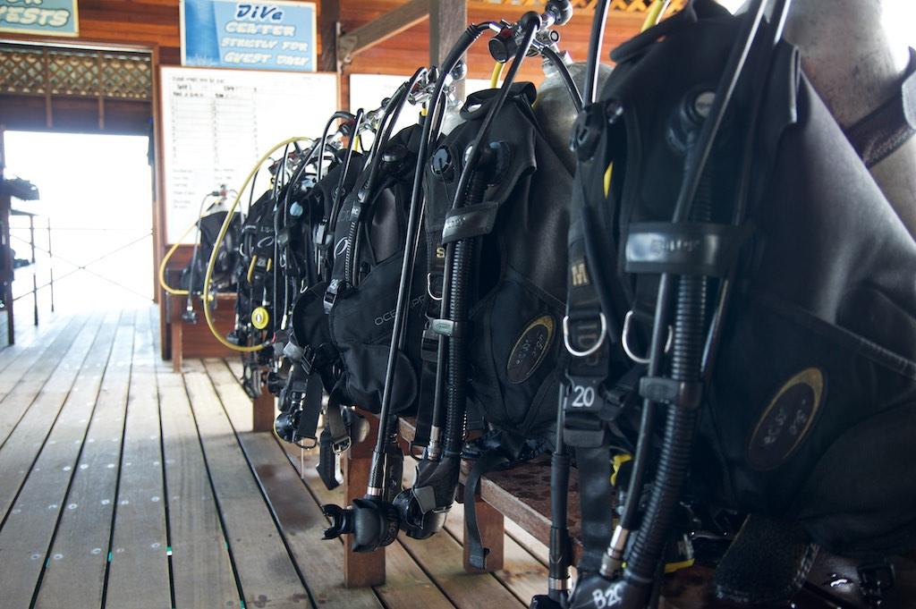 At 08:00 we went to the dive center, which was located at the jetty in front of the island. The dive masters were already present and our kit assembled for us. We were really getting spoiled over here. The first dive of today was a wreck dive. Not far ahead there were two wrecks, a wooden one and a steel one.