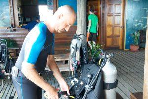 During dinner it started to rain again, a heavy tropical rain. Actually we were rather enjoying it and it brought that refreshing breeze. We spent the evening chatting with some other guest of the island and time flew by to quickly. It was still raining when we went to bed and the noise of the raindrops on our roof was deafening. Still we managed to fall asleep and by the time we woke up in the morning the rain had gone, sun was shining so what else could we wish for? Breakfast and an early morning dive perhaps?