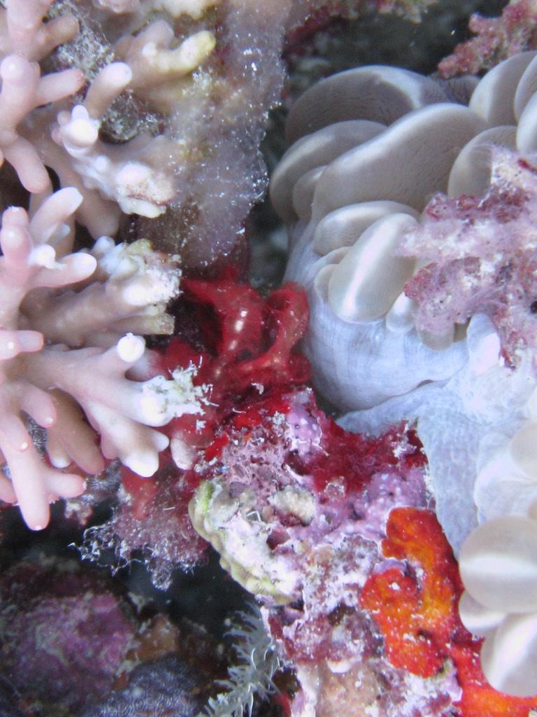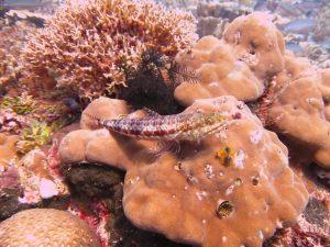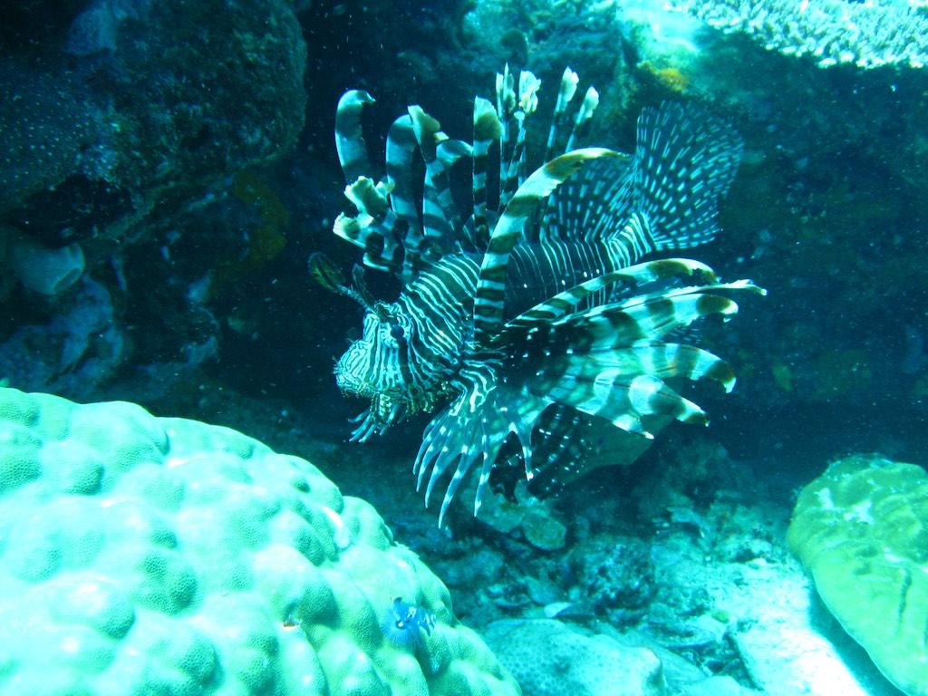 An hour or so to relax after which we had our first orientation dive. It was good to get used to diving again after an almost 8 year break. In front of the jetty a kind of track was set up which led us past a number of interesting objects which housed a lot of fish, and even a small wreck. As the tide was changing visibility was not that good but our guide pointed out lots of interesting things. Ghost Pipefish, shrimps, lionfish, not bad for a first dive. It was good to use this dive to check our weights and refresh our, by now, rusty diving habits. Both of us were amazed how well it went so now we are ready for the boat dives tomorrow.