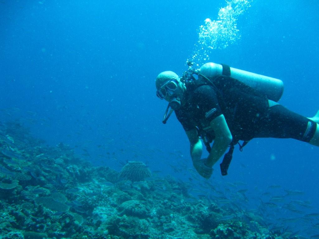 To let lunch settle I went for another hike around the island. After that it was diving time again! Yippee! I buddied up with Sara, an English lady we had met on the boat. There was yet another coral reef to explore. The absolute highlight on this dive was a baby batfish, something that even delighted the guides, as they are extremely rare to spot. I particularly loved a big squid that was carefully checking on what we were doing. Once again there was a lot to see and the dive ended far to soon.
