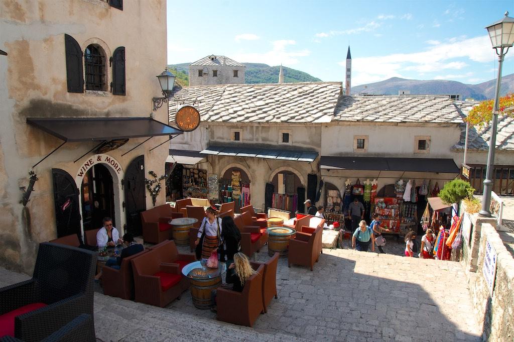 Back at the bridge we spotted a kind of lounge bar, a good place to relax and soakn the impressions of today. We opted for a Bosnian red wine, something we had not tried before and will most likely not try again. It was called a wine but it was more like a noble vinegar, a liquid that would have tasted nice as a topping on a salad but definitely not as wine. Not surprisingly we did not finish our drinks and returned to one of the terraces overlooking the old bridge for dinner and… a white wine.