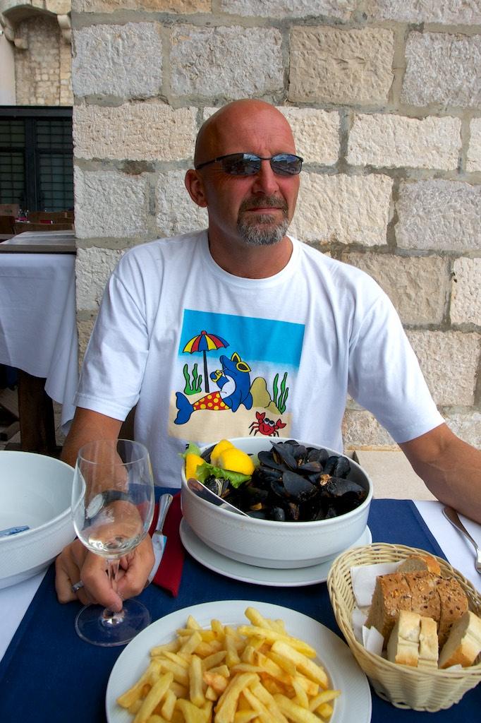The rain however made us decide not to visit another picturesque town in the area, Solina, but then, one can’t have it all. Back in Trogir we headed back to the same covered courtyard as the day before where, whilst enjoying a glass of wine or two, Paul was enjoying his, as far as I can guess, fourth book of this holiday. I downloaded the last Marillion album (Could not wait until my arrival at home) and submerged myself into ‘ Sound’s that can’t be made ‘. We decided not to move for dinner and spent it at the same place. As it was still raining and we knew food as good here there was no reason to move. And so another evening went by…
