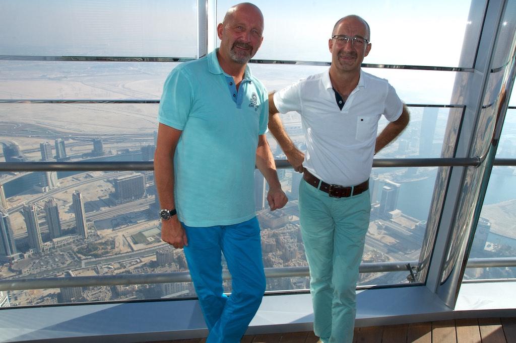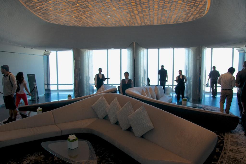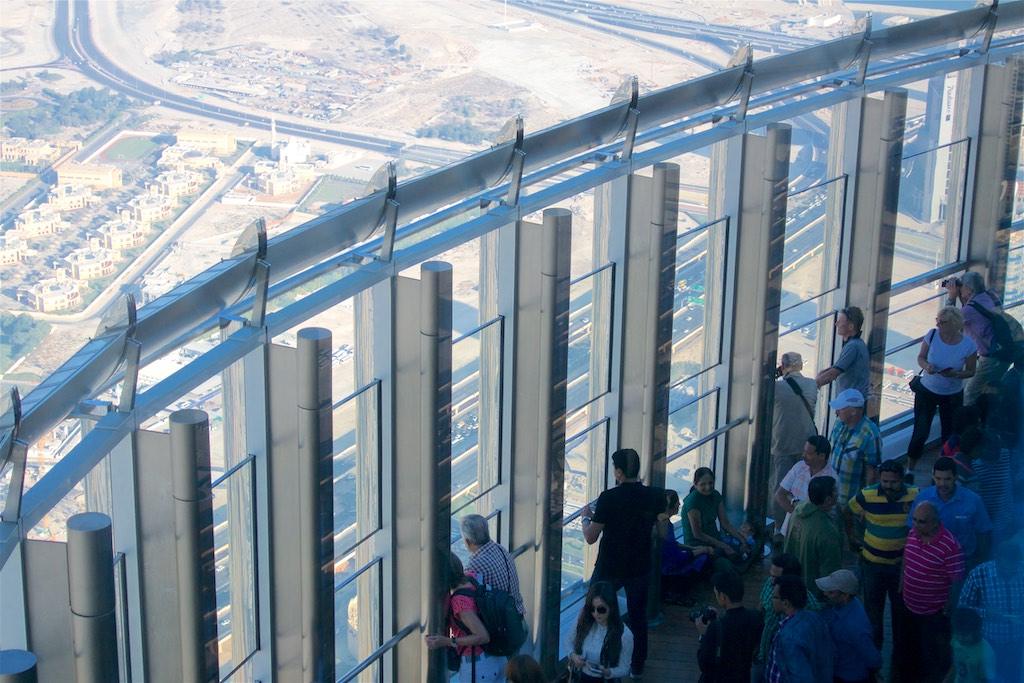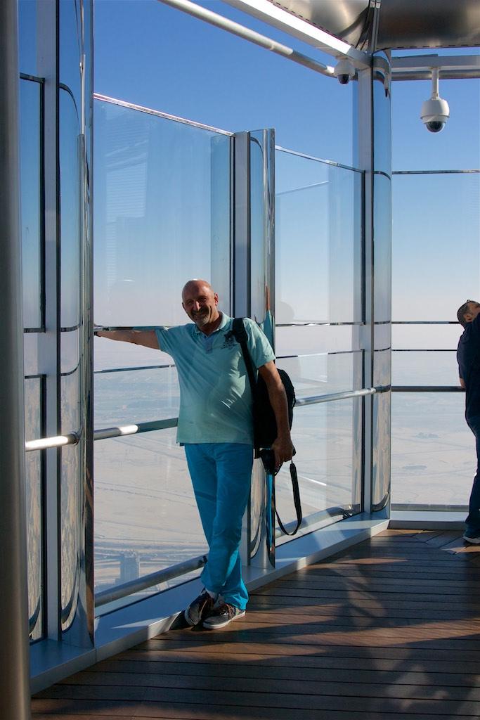 With a drink in one hand and a snack in the other we rushed to the floor-to-ceiling glass walls where we were blown away by the view. We were under the impression we saw Dubai from a plane but we were definitely in a building at the 148th floor at 555 meters. Only at 2/3 of the actual building as there was still 275 meters of building above us. Absolutely amazing! There even was an outside terrace so we could not resist going there as well.