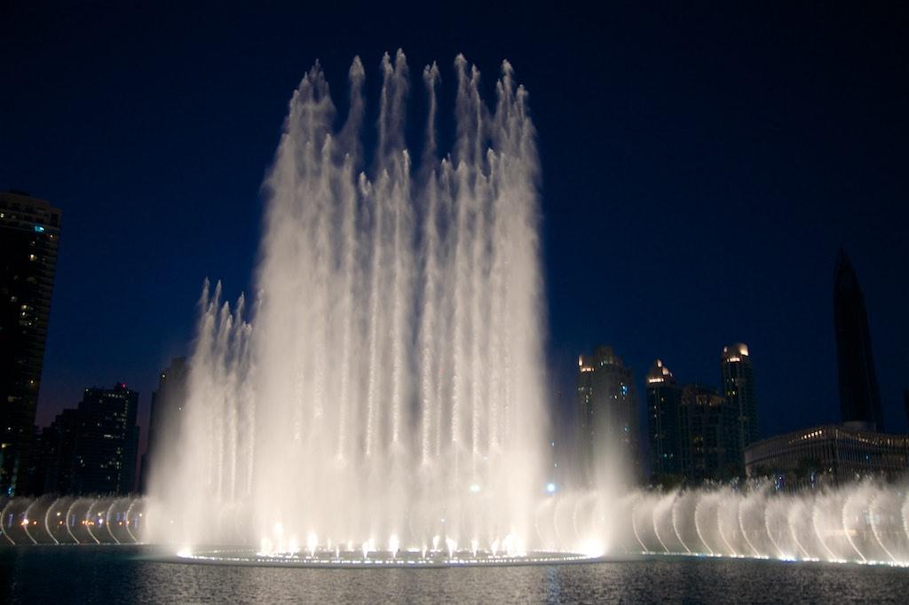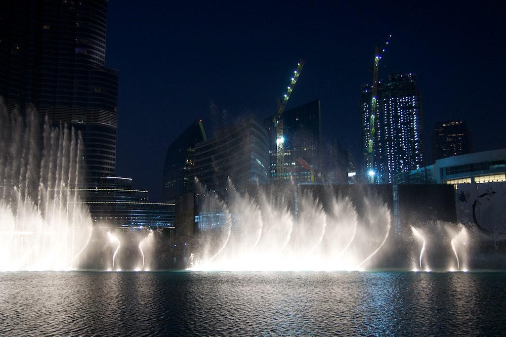 Initially we planned to witness sunset from the 125th floor but then, to be honest, there is only so much of buildings to admire and we did not feel like waiting an hour or so for something that would without doubt be spectacular. So we descended back to ground floor and headed towards the Dubai Fountain Lake. (The biggest man made lake in the world containing 22.000.000 liter of water, and yes, it is in the Guinness Book of World Records). After we enjoyed a drink at one of the terraces we found a perfect front-row spot to witness the spectacle of another Guinness record… The Dubai Fountain that shoots water up to 150 meter high! The show started at 6pm exactly and spectacular it was. With the Burj Khalifa in the background we witnessed a spectacular water and light show whilst the water jets were in sync with the high notes and beats of the music played. Well worth the wait!!