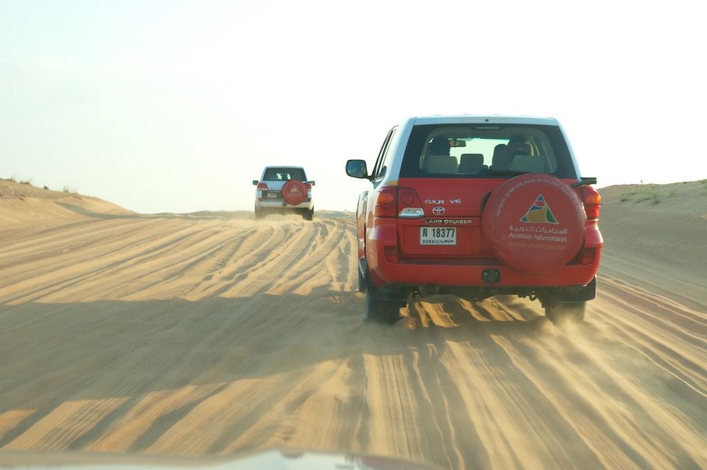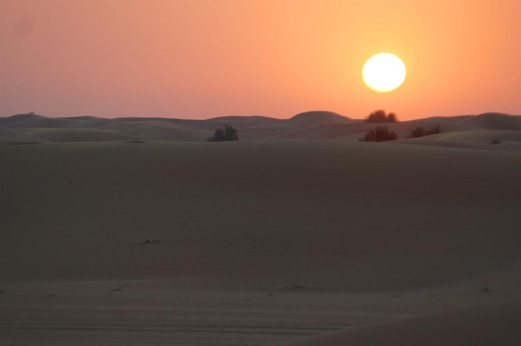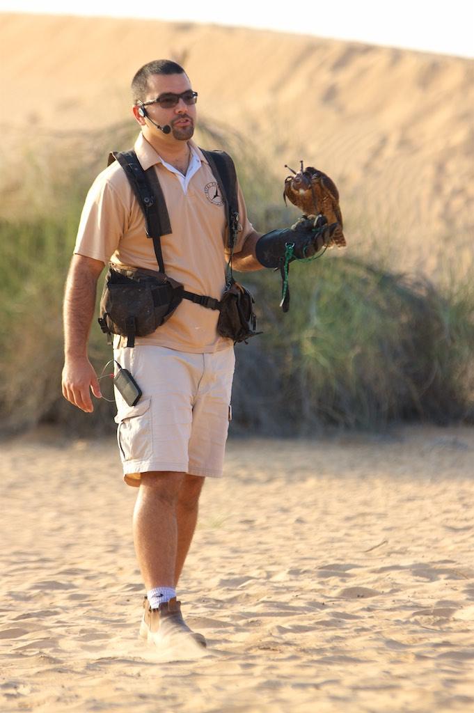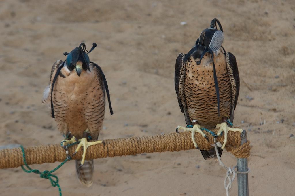 For our last day in Dubai we had booked an Arabian Adventure… We were picked at our hotel up by a 4 wheel drive and headed towards the desert. There the tires were slightly deflated and we went off road. The first stop was at a camp for a falcon experience. A falconer explained about the falcons and what was going to happen after which he released the falcon and let it fly for a couple of minutes. Then he started to swing a piece of bait on a rope after which the falcon made several airstrikes to catch it. Of course he succeeded which was the end of this interesting show.