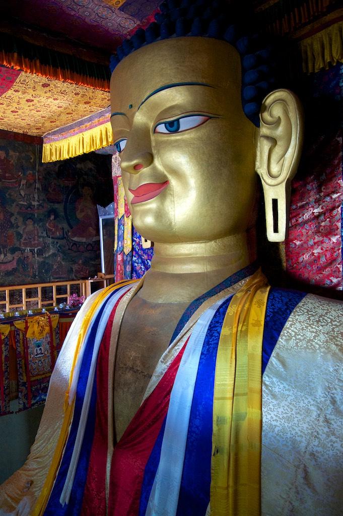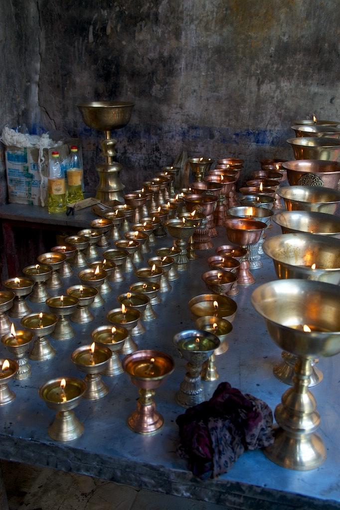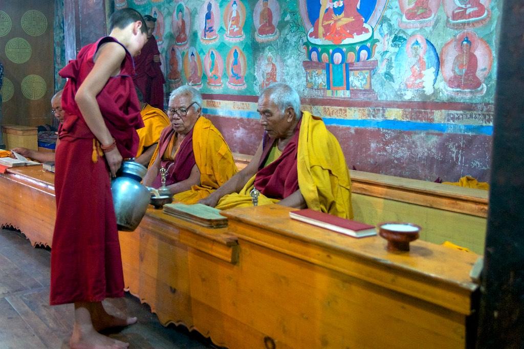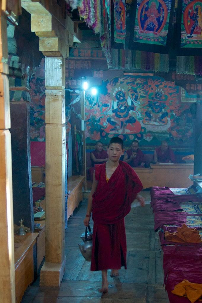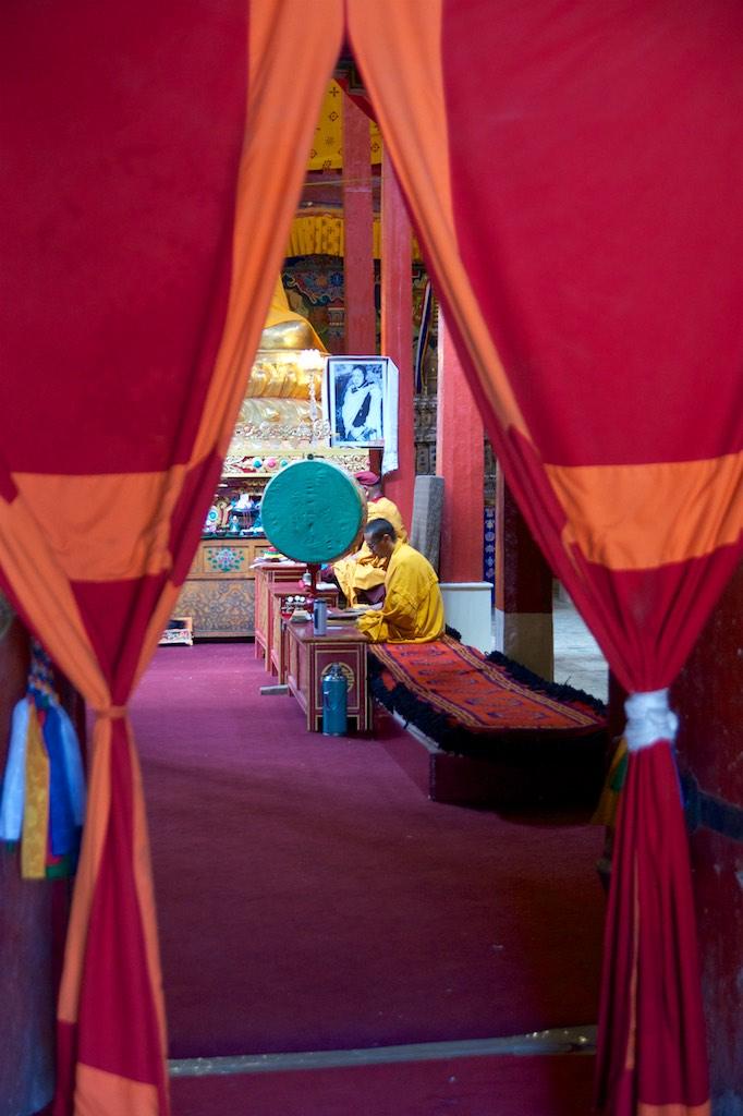 Thiksey monastery was built on top of a hill, a striking position and staggering views. It is very much a living, working monastery, something that we immediately noticed on arrival when we could hear the monks blowing the horn. I got very excited by the prospect of seeing a prayer session going on so we skipped the first temple and headed straight to where we could hear the noise coming from. Once we stepped into the temple we were entering another world. Monks were singing and praying, lead by two senior monks. At intervals the praying got louder, horns were blown and drums were beaten. Two young monks had to bang the drums and at the quitter moments provide the older monks with chai, the Indian milky tea. Shivers ran down my spine as the atmosphere to me was tremendously moving.