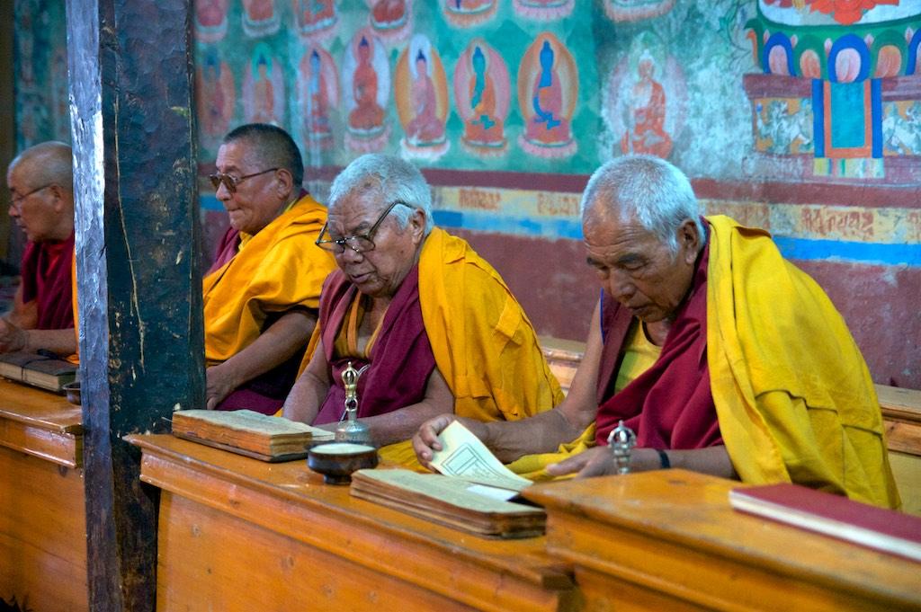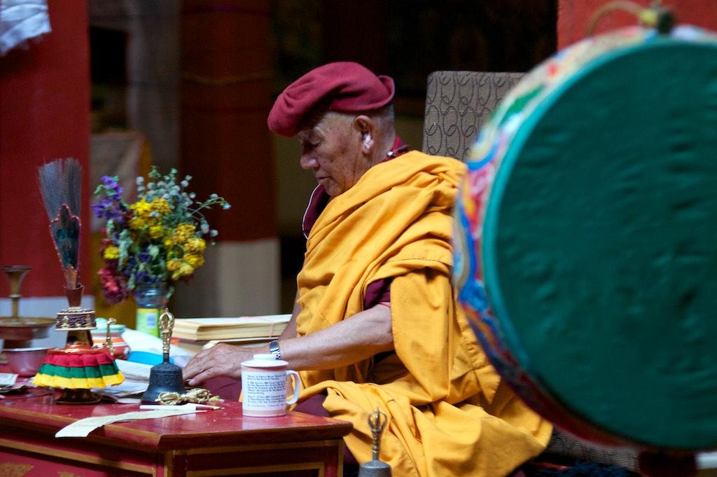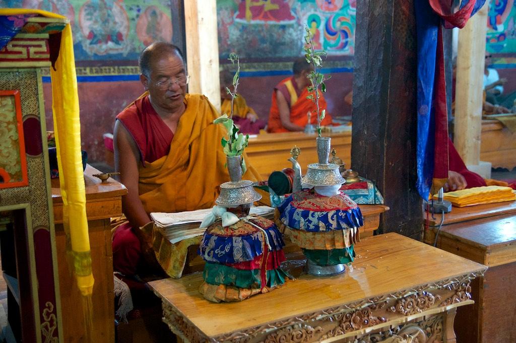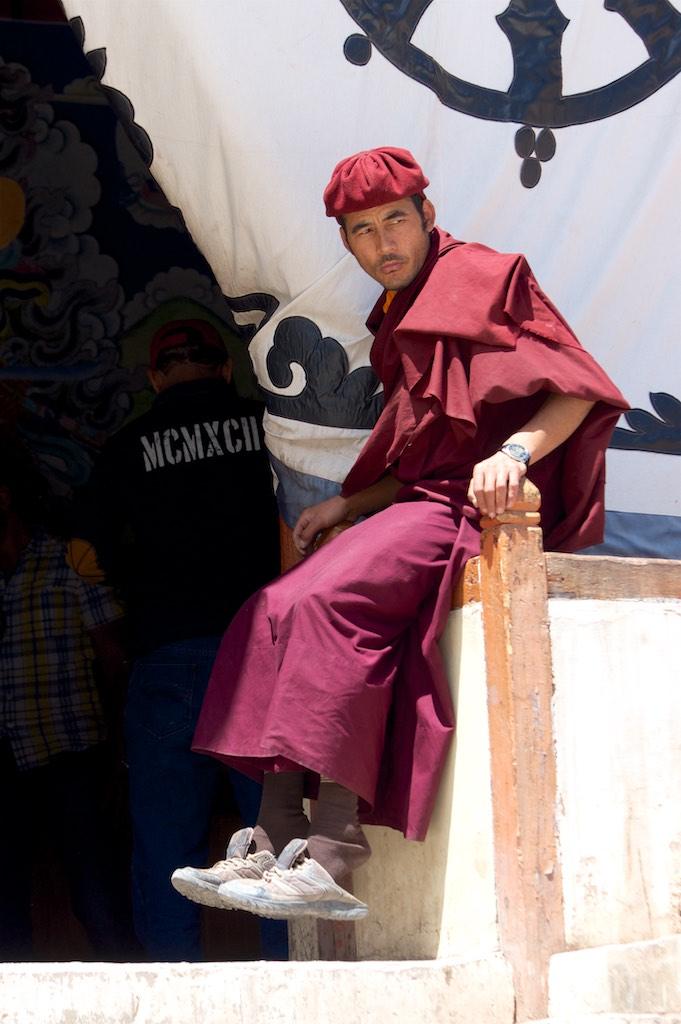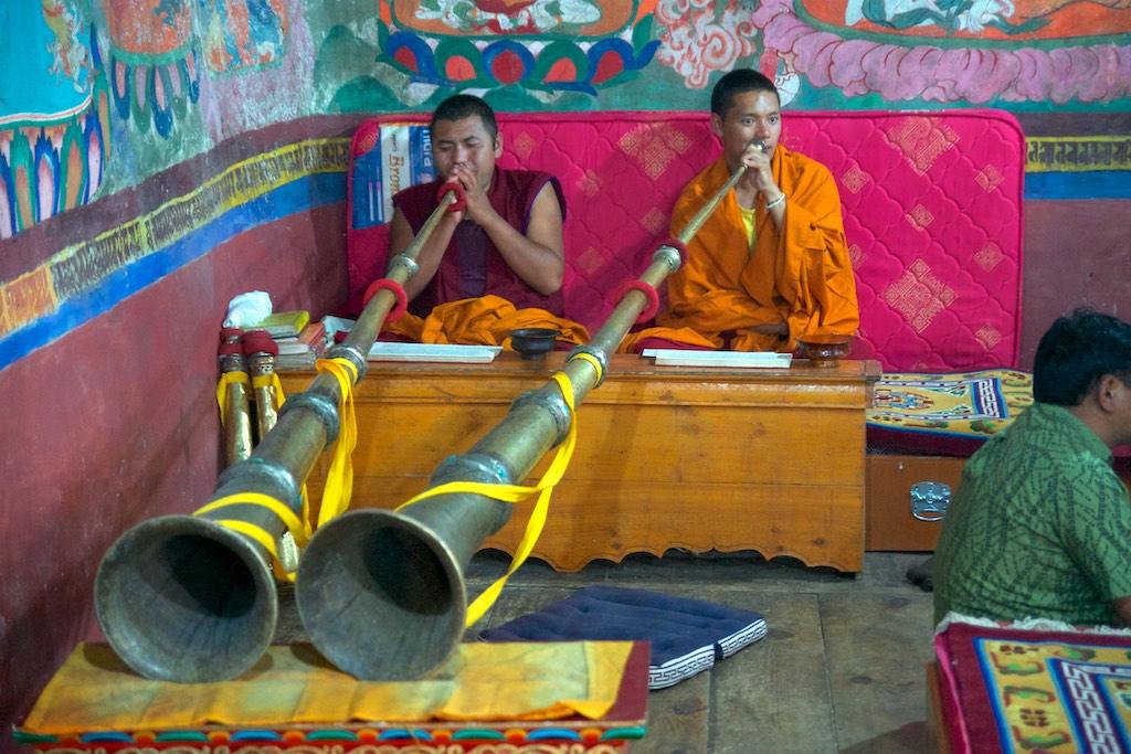 Thiksey monastery was built on top of a hill, a striking position and staggering views. It is very much a living, working monastery, something that we immediately noticed on arrival when we could hear the monks blowing the horn. I got very excited by the prospect of seeing a prayer session going on so we skipped the first temple and headed straight to where we could hear the noise coming from. Once we stepped into the temple we were entering another world. Monks were singing and praying, lead by two senior monks. At intervals the praying got louder, horns were blown and drums were beaten. Two young monks had to bang the drums and at the quitter moments provide the older monks with chai, the Indian milky tea. Shivers ran down my spine as the atmosphere to me was tremendously moving.