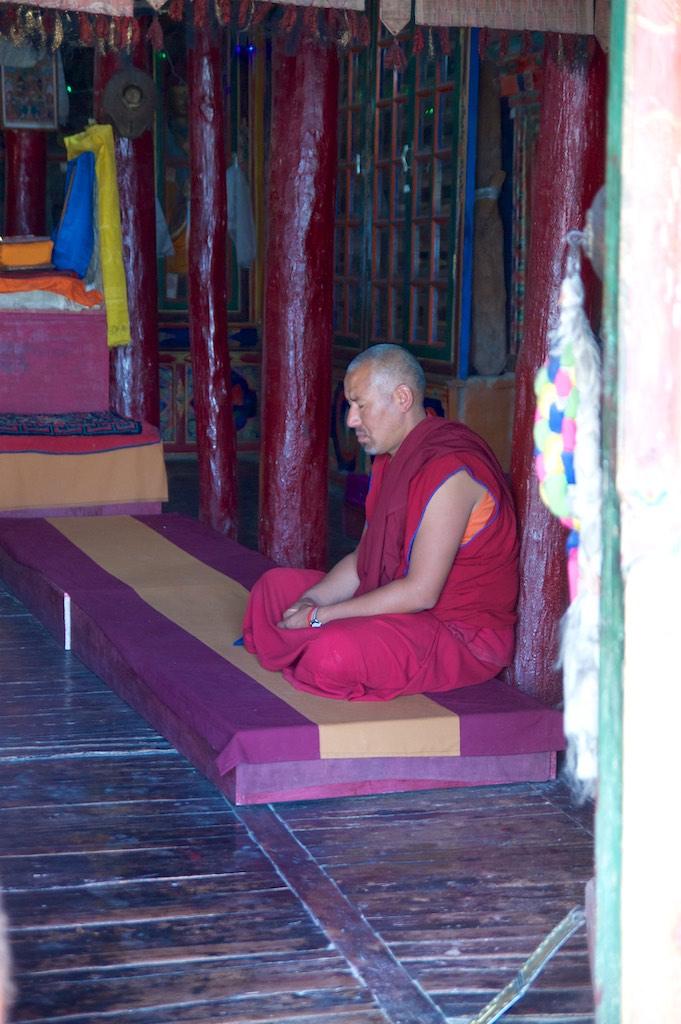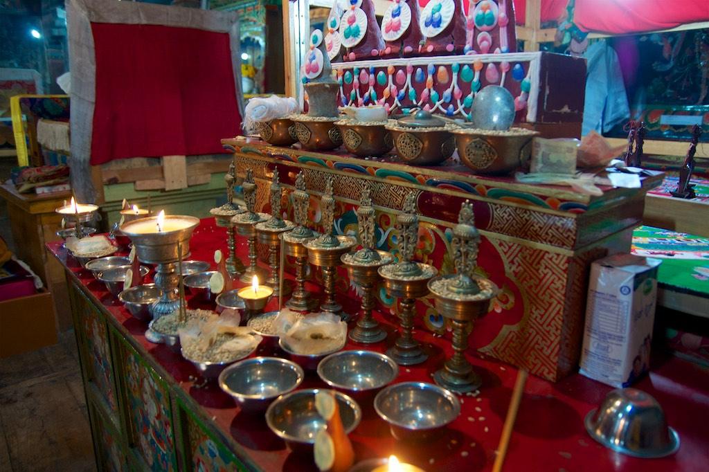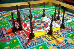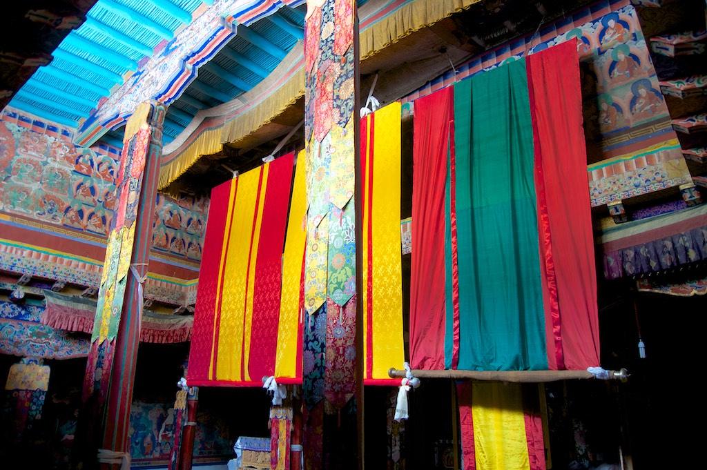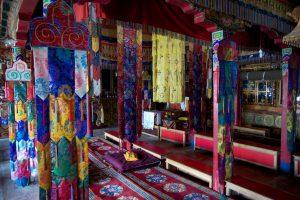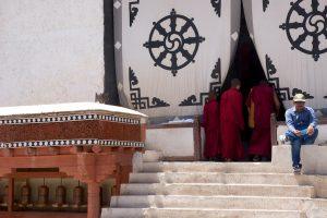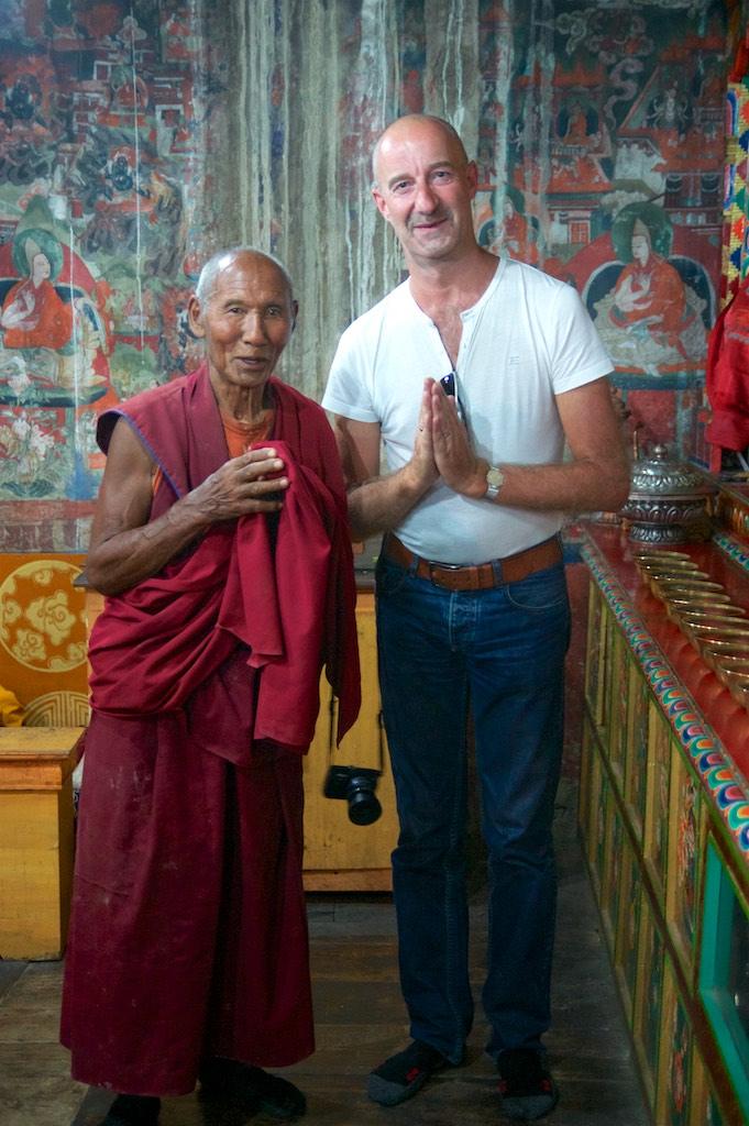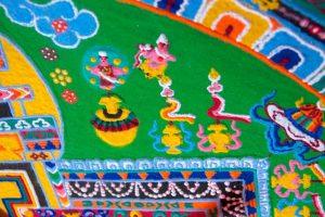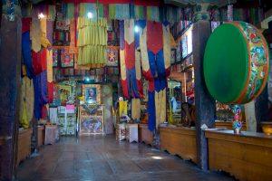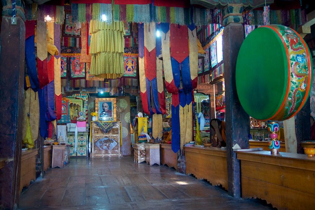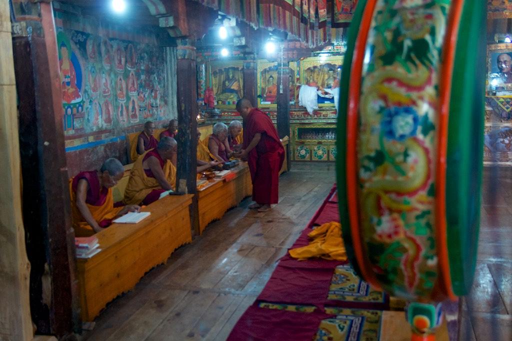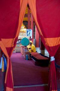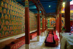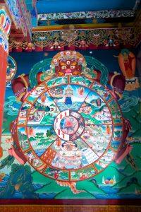 Whilst listening to the prayers we slowly moved around the prayer hall to admire the frescos, the numerous statues and the decorative pieces of cloth hanging down from the pillars. In the back room we could see a giant Buddha but at the moment I discovered a beautiful sand mandala my heart skipped a couple of beats. The amount of detail was overwhelming, it was like a beautiful picture but then totally made of sand. The monks must have worked months on it, only to be wiped away during a special ceremony, proving the mortality of everything.