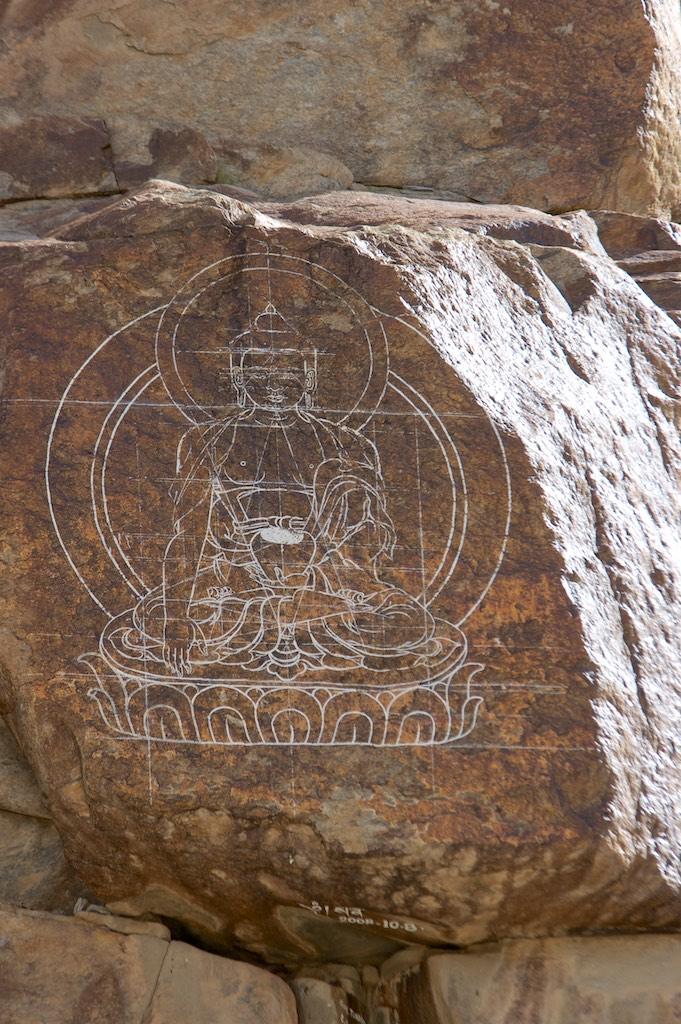 After about two hour drive we arrived at Mulbek where a tall rock sculpture of the Maitraya Buddha was to be admired. In front of it a small temple was build with the usual relics, still I did enjoy being there.
