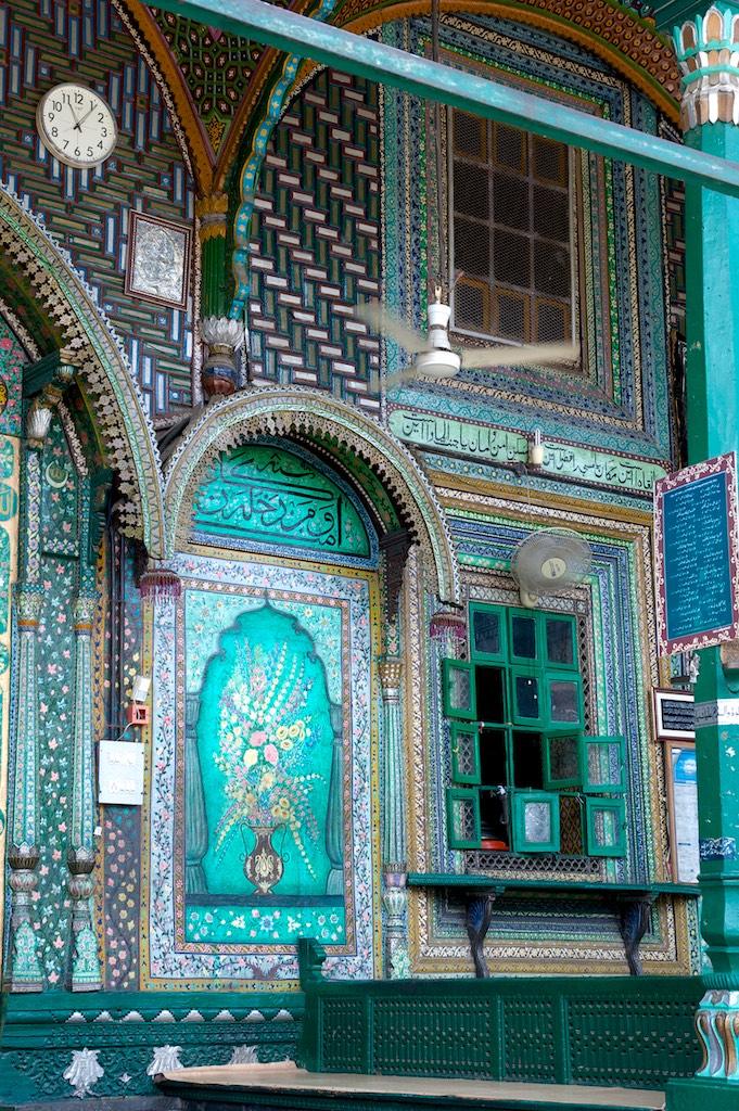 Our next visit was Sarson Ke Khet, another mosque which was totally erected in Cedar wood. Beautiful paintings covered the ceilings and although they were slightly damaged by the tooth of time we still got a good impression of them. Also the entrance was beautifully decorated but this time, we were not allowed inside, as a lot of praying was going on at the moment.
