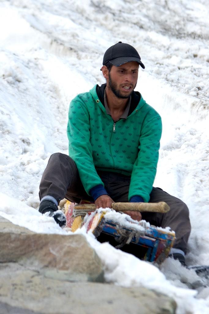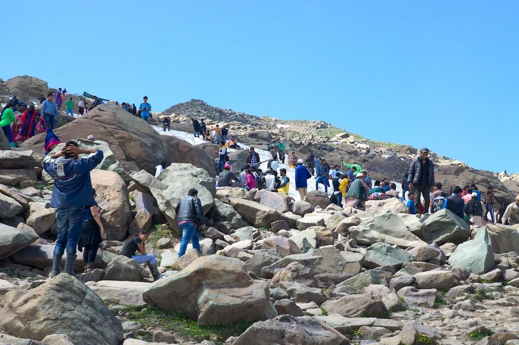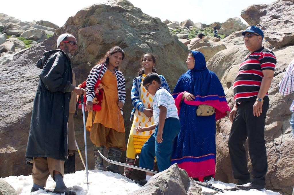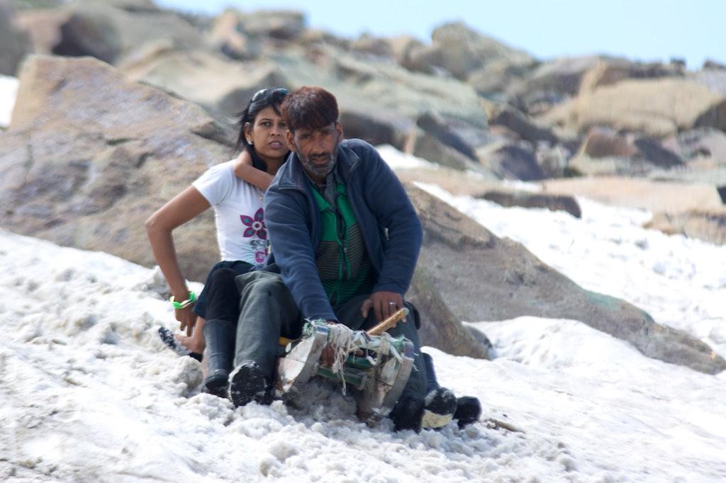 Unfortunately we had forgotten to put on our hiking boots which made the ascend over the rocky surface a bit more tricky but we managed anyway. The sheer joy and fun of the Indians who had been traveling long way to enjoy some fun in the snow was truly infective. Paul and I thoroughly enjoyed ourselves and kept laughing about the funny activities. Booted ladies, dressed in their colorful saris tried to make their way up to the snow, some more successful than others. The unlikely combination of a Sikh in the snow brought a smile on our faces. tthe way how people sat on a sledge and were dragged by two ‘ski-instructors’ to the summit, in order to came down in a clumsy way was simply hilarious. Skis were placed in such a way that photos could be made of the people standing behind them, giving the impression to be actually skiing, which without doubt would cause jaw dropping impressions once back home (the photographers were even carrying bags with printers so the result could be seen immediately). And yes, there was even some real attempts for skiing going on. As said, the whole scene was too hilarious to be true and we stayed for over an hour watching what was going on, something that could have come directly out of a slapstick movie.