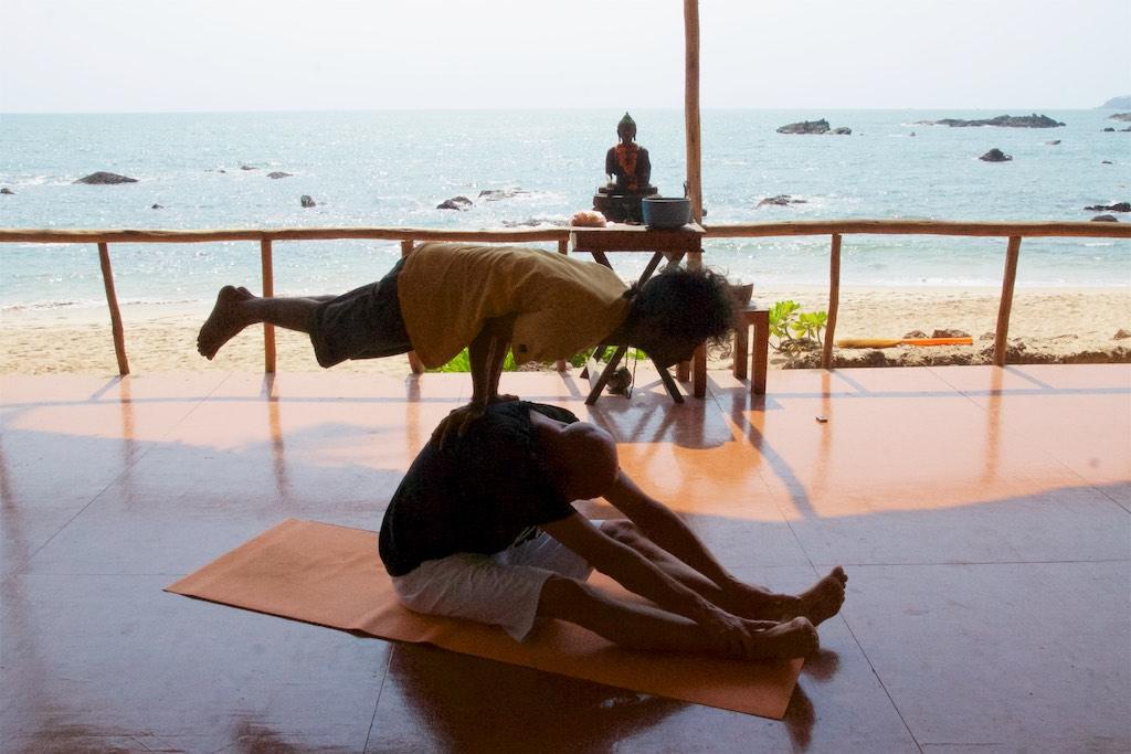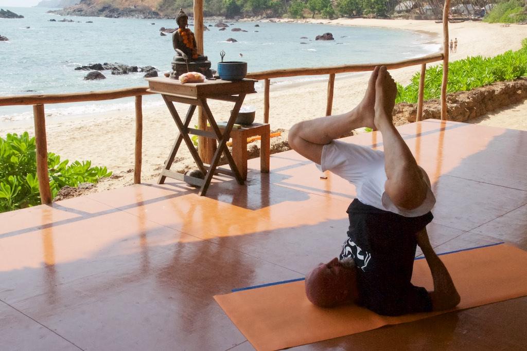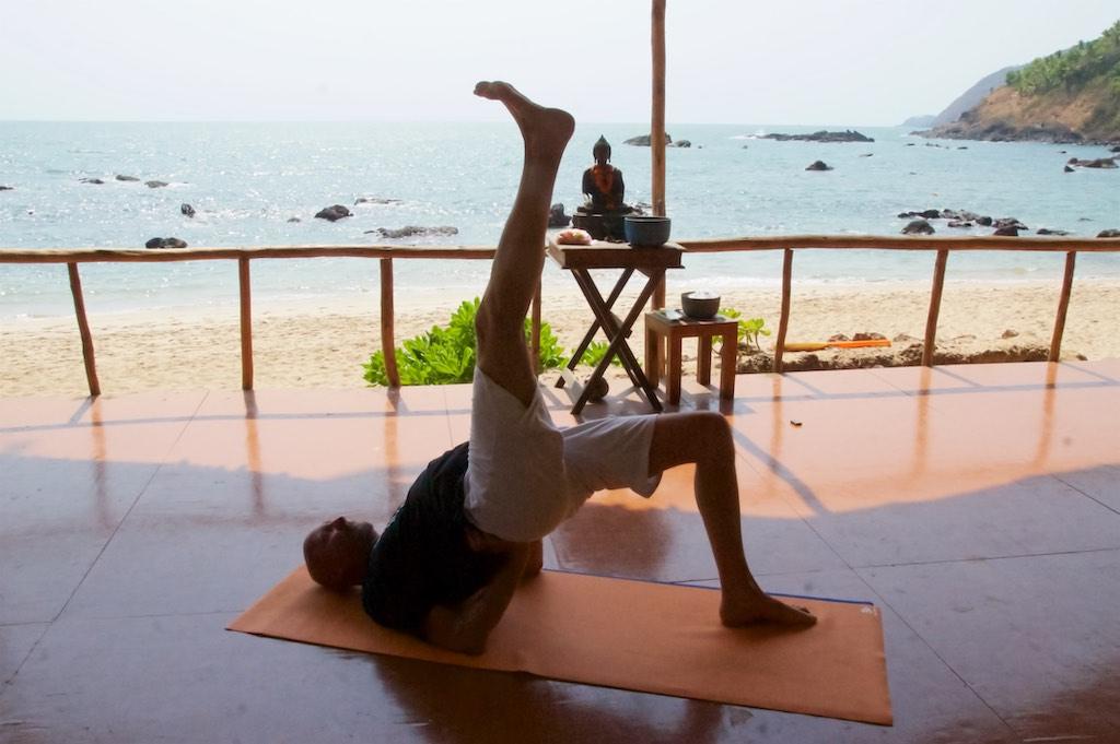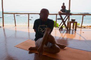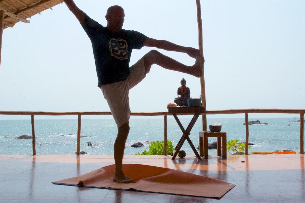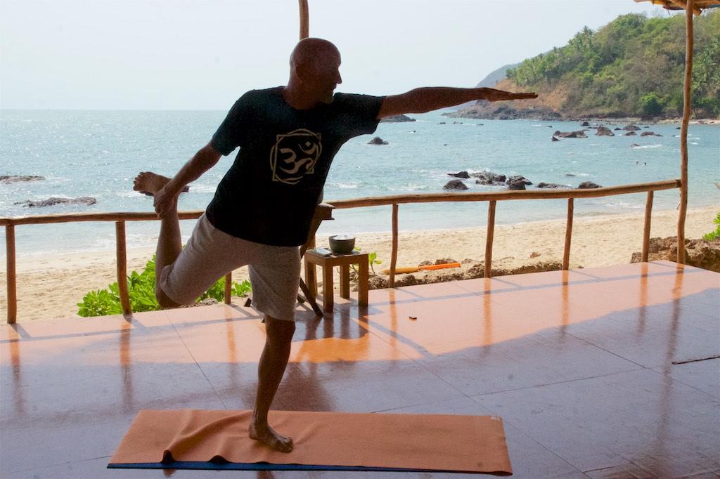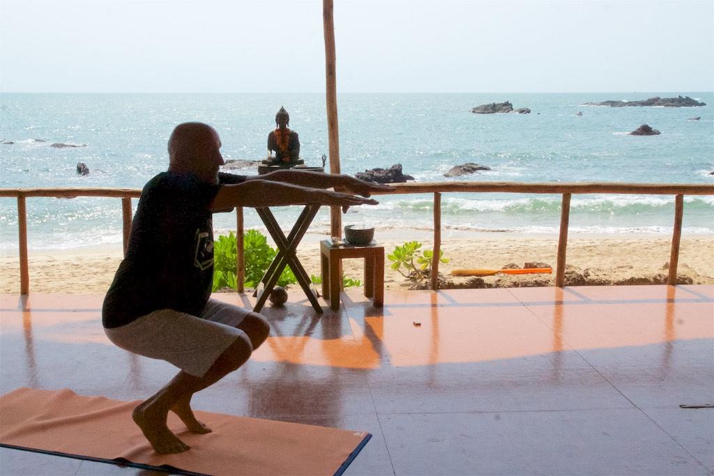 After the afternoon session a wonderful dinner was served in the newly built restaurant. I had always loved Sunil’s dishes but clearly the new kitchen offered him a lot more possibilities and that was reflected in the food.It is amazing how fast time flew by although not a lot was going on. It seemed to me the daily routine was like a meditation by itself. Every morning the alarm went off at 6:45 after which I had a quick wash and dressed up in my yoga gear. Relaxing at the veranda of my bungalow a ginger lemon tea was served by Vijay and whilst zipping from it I soaked up the breathtaking views and listened to the sound of the crashing waves on the shoreline. Not much later the bell rang, the sign the classes were about to start. As it was far more busy than last year there were two classes. Pardeshi was leading the advanced class, at a high pace and less explanations, whilst Ravi led a more mellow paced class with more explanations for the beginning yogi. I decided to do the advanced class and due time I noticed I was getting a bit more flexible and was even able to get into the more complicated asanas (poses). It made me feel pleased and happy but then, whilst watching some of the extreme Asanas that Pardeshi seemed to do completely effortless, I landed with both feet back solidly on the ground.