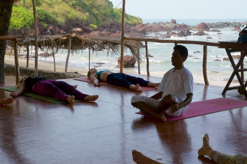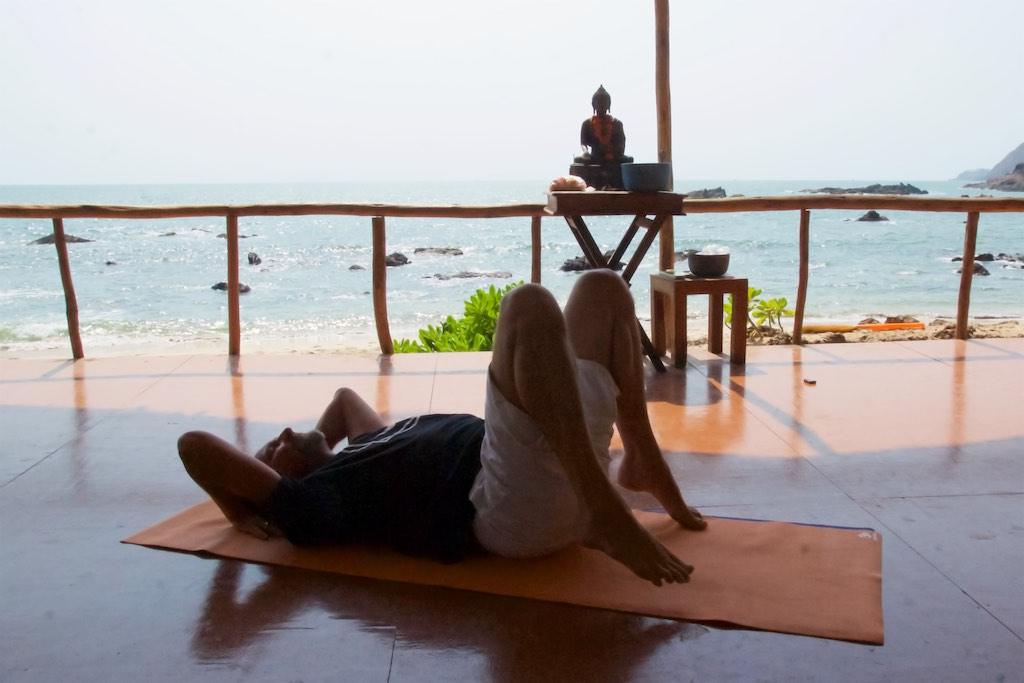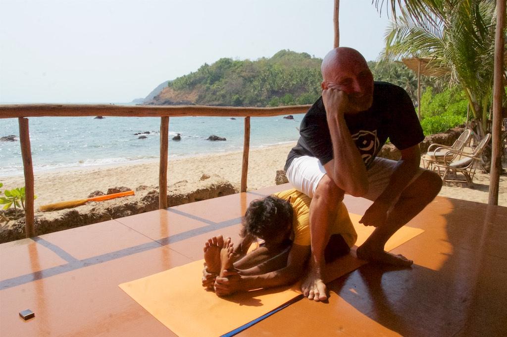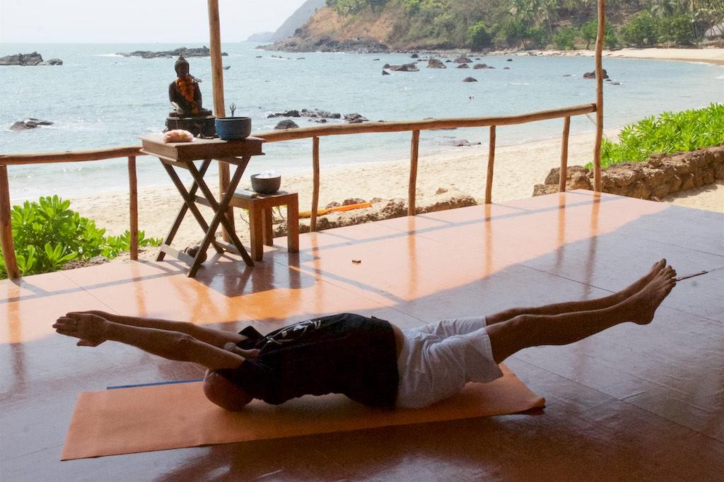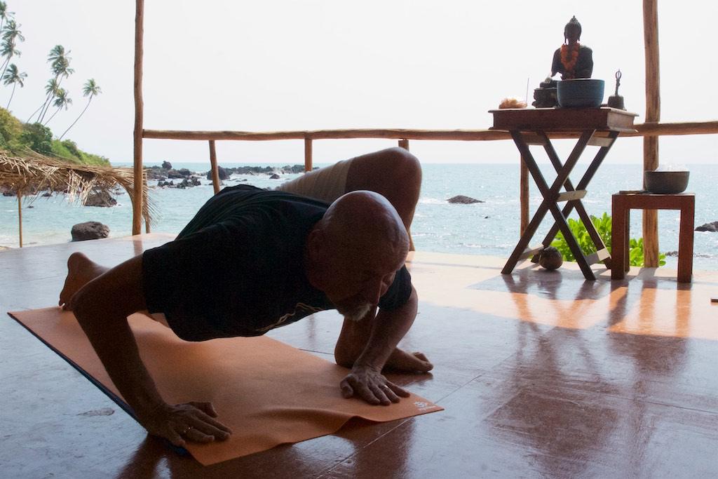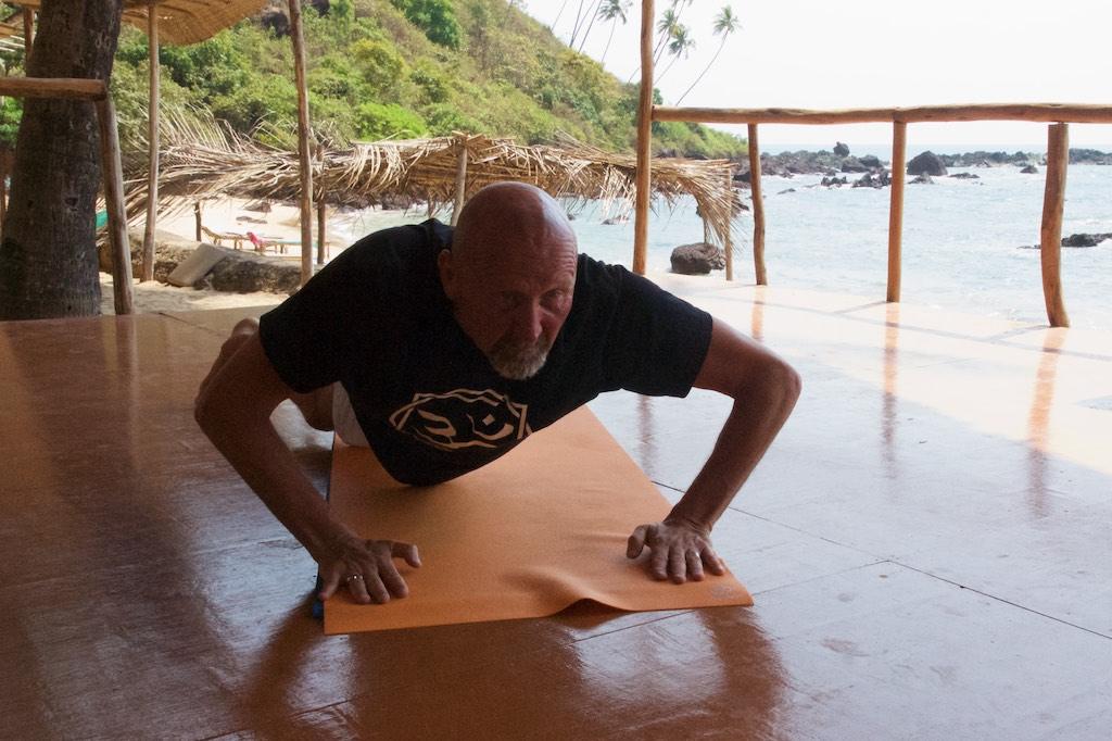 After the afternoon session a wonderful dinner was served in the newly built restaurant. I had always loved Sunil’s dishes but clearly the new kitchen offered him a lot more possibilities and that was reflected in the food.It is amazing how fast time flew by although not a lot was going on. It seemed to me the daily routine was like a meditation by itself. Every morning the alarm went off at 6:45 after which I had a quick wash and dressed up in my yoga gear. Relaxing at the veranda of my bungalow a ginger lemon tea was served by Vijay and whilst zipping from it I soaked up the breathtaking views and listened to the sound of the crashing waves on the shoreline. Not much later the bell rang, the sign the classes were about to start. As it was far more busy than last year there were two classes. Pardeshi was leading the advanced class, at a high pace and less explanations, whilst Ravi led a more mellow paced class with more explanations for the beginning yogi. I decided to do the advanced class and due time I noticed I was getting a bit more flexible and was even able to get into the more complicated asanas (poses). It made me feel pleased and happy but then, whilst watching some of the extreme Asanas that Pardeshi seemed to do completely effortless, I landed with both feet back solidly on the ground.