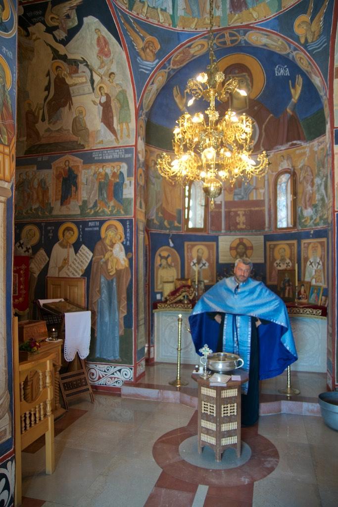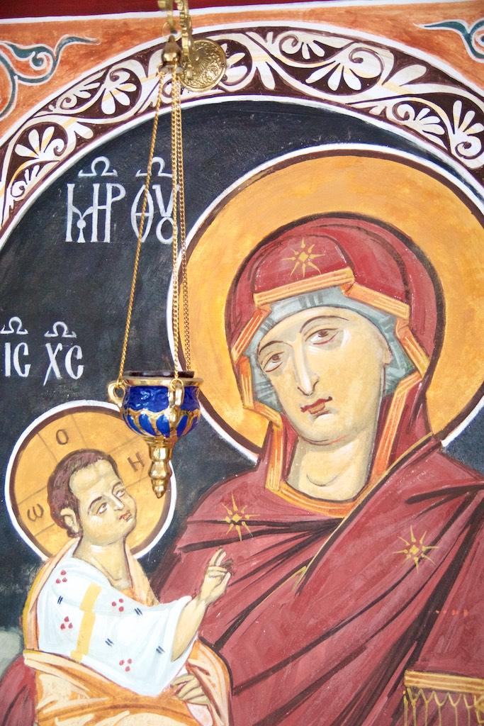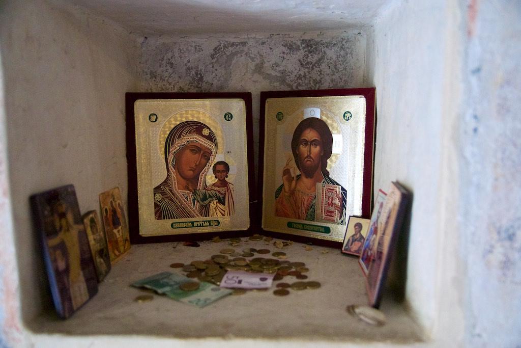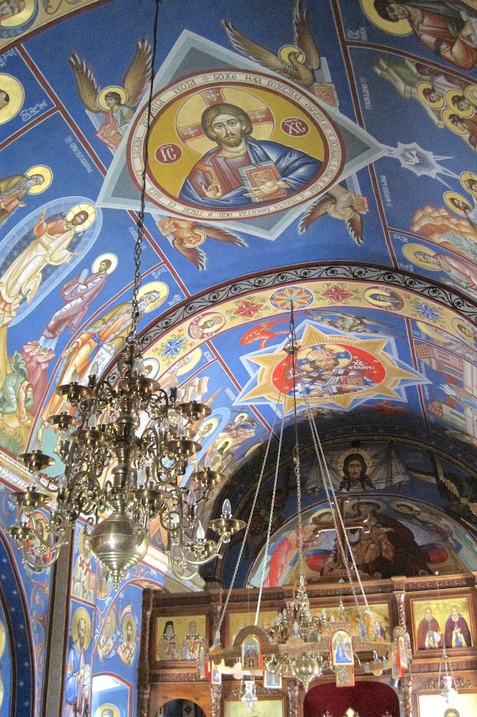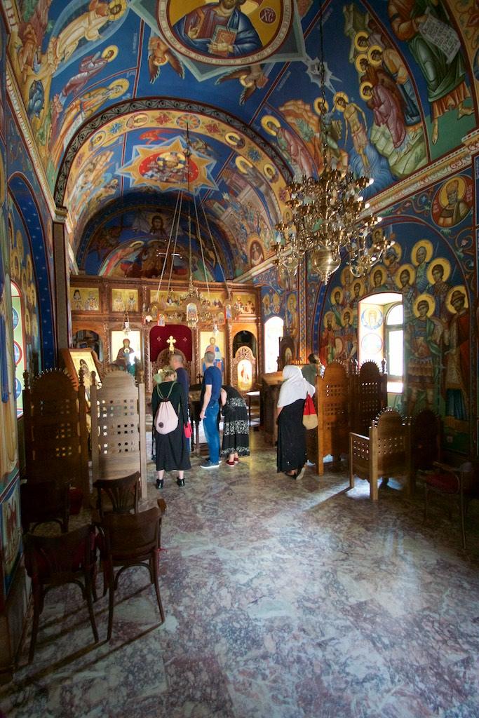 Finally we made it to the entrance and were guided into a small room, where the walls were covered with frescos. Only a couple of people were allowed in at a time into the small room and an orthodox priest was guarding an open coffin with what must have been the remainders of someone important. Although all of the pilgrims kissed the remainders I thought a respectful bow would be enough, which resulted in a disapproving look of the priest but I simply was not willing to extend my level of admiration to kissing a covered dead body.