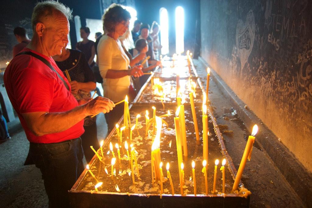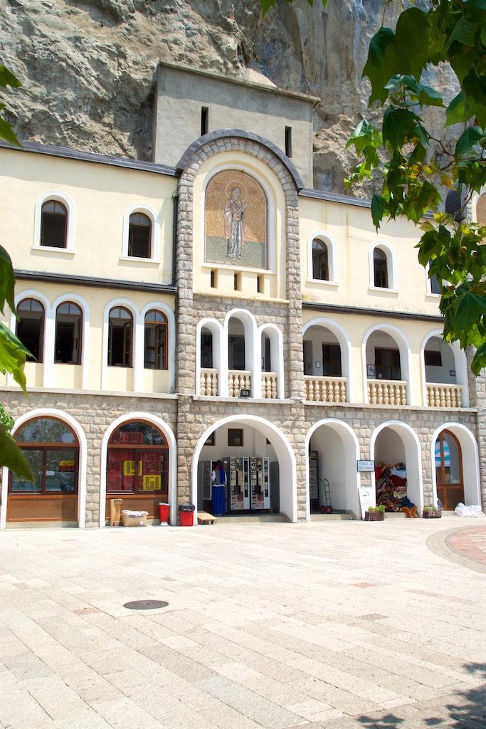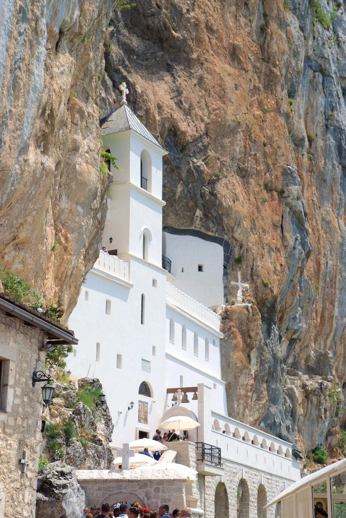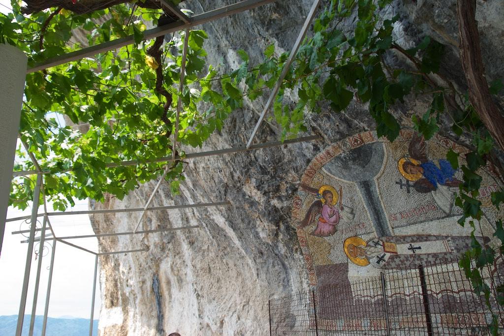 We were now approaching the Ostrog monastery, one of the 4 most important religious centers in Montenegro. First we stopped at a small church that was covered with fresco’s. Someone was reciting from the holy script and religious people were saying there prayers and kissing the relics, as usual in orthodox churches.