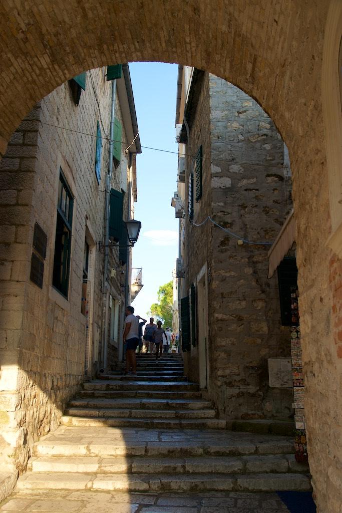 After sunset we walked into Kotor, which was like a time-travel back to a Europe of moated walled towns with shadowy lanes and stone churches on every square. Squeezed between the mountains and the bay, and overlooked by the ruins of a majestic ford it that special atmosphere. Not unexpectedly Stari Grad, the old town, was now housing a large collection of souvenir shops and restaurants but still we loved the cozy atmosphere. To make it even more dramatic at almost every corner music students were playing both classic and modern music which really added to the atmosphere.