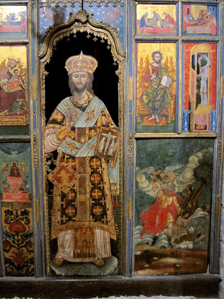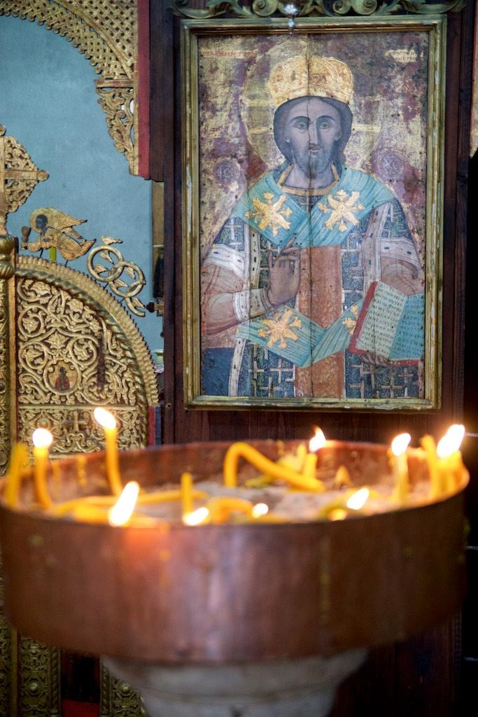 We climbed up the stairs inside the monastery and came into an area which was filled with mosaics. Also from here we had stunning sights over the square below and the surrounding valley. Before we left I visited another chapel that was used for burning candles, a great atmosphere with the walls and roofs blackened from the smoke.