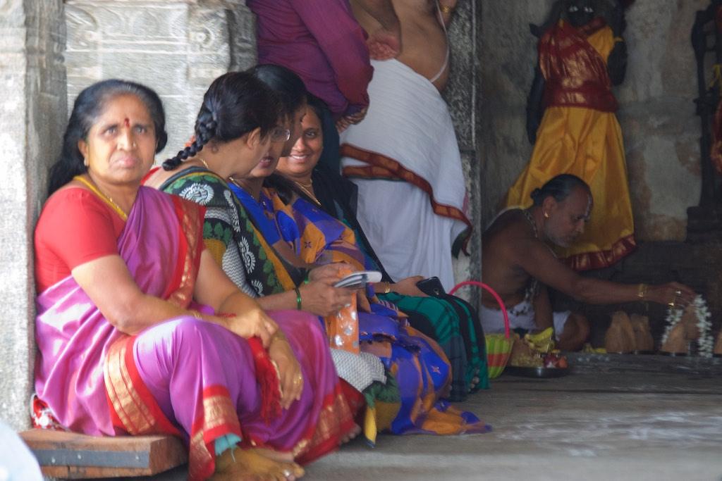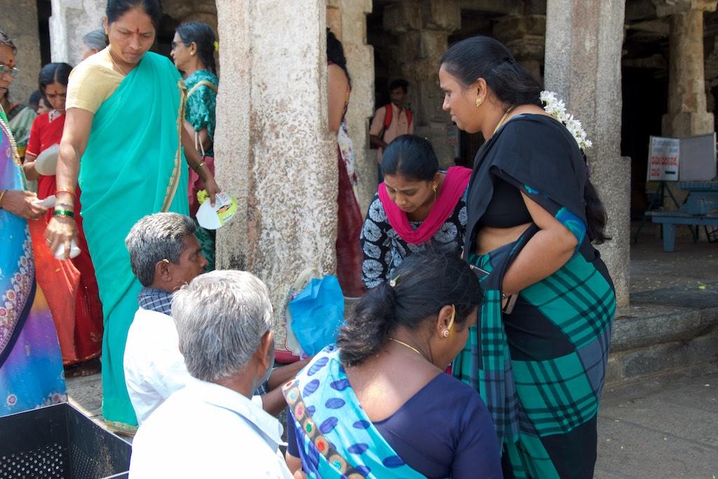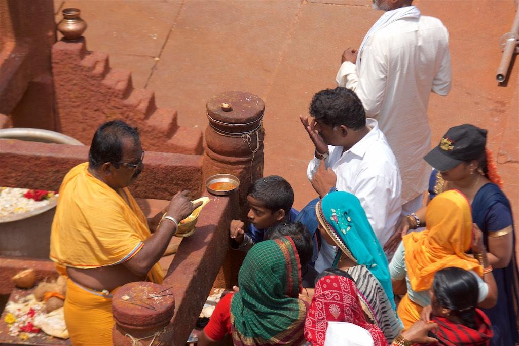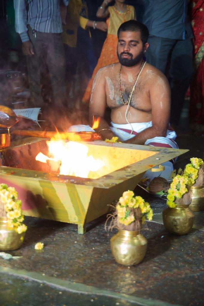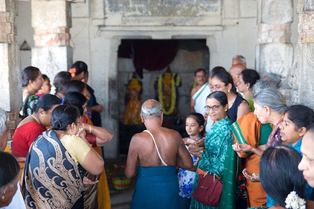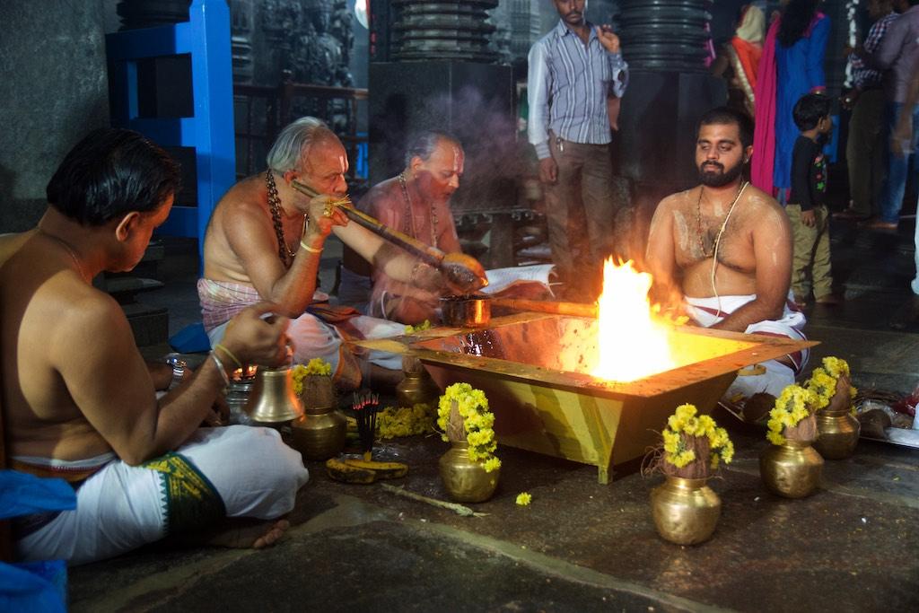 I entered through a gate that is so typical for South Indian Hindhu temples and arrived at a large square around which the several temples were located. There was a lot of activity going on and my attention was grabbed by a group of people who were singing so I headed over there. I witnessed priests were performing a ritual whilst the devoted worshippers were chanting along.