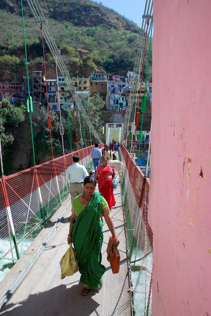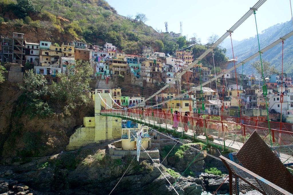A small path lead towards the hanging bridge with small shops and stalls at either side. Being located at such an auspicious place it came to no surprise that a small temple was built at the location where a meditation cave had been found that was much, much older. I was lucky enough to witness a small arti (prayer ceremony) at the temple after which I climbed down the steep steps towards the hanging bridge to get back to the other shore.