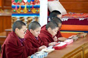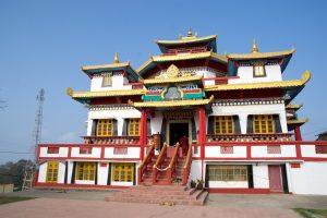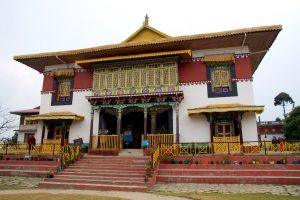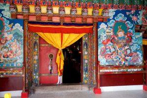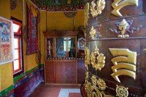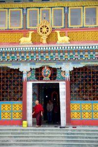 Behind the monastery, stairs rise beside the distinctively painted Karma Shri Nalanda Institute of Buddhist Studies, leading quickly to a smallish room containing an ornate Golden Stupa, studded with turquoise and amber gemstones. That’s the reliquary of the 16th Karmapa, founder of the current complex and considered almost a saint hereabouts.