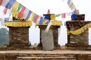 Not much later, and without having fallen down, we arrived at the Dubdi Gompa. Established in 1647 in honor of Lhatsun Chenpo, Dubdi it is said to be Sikkim’s oldest still-functioning monastery. Located high on the ridge above Yuksam, this compact, peaceful gompa is beautifully set in tended gardens, and if the fog wasn’t obscuring the view I would have enjoyed dawn views of white peaks between high green folds of forested foothills. But no complaints about that.