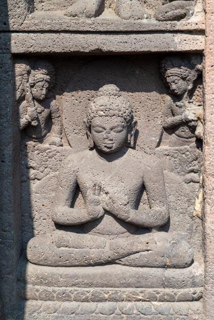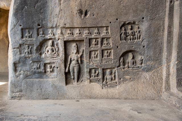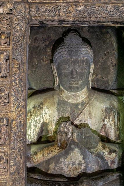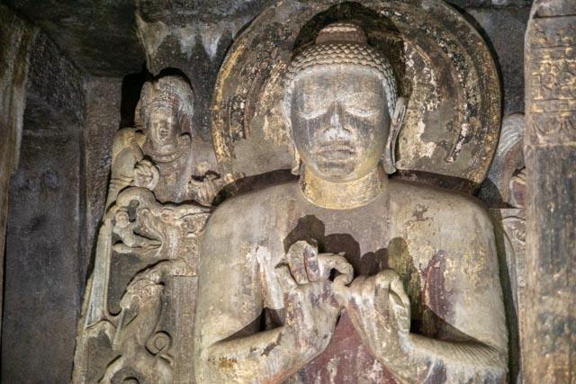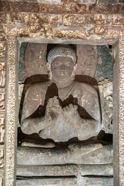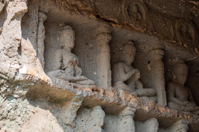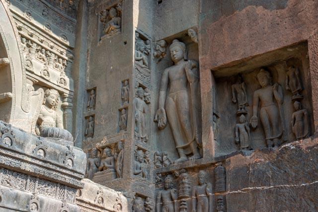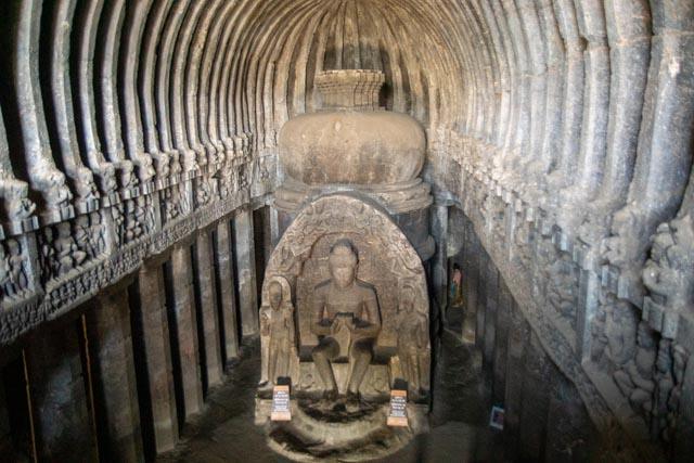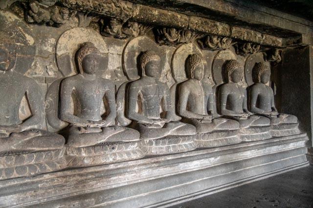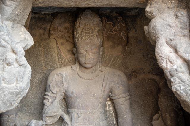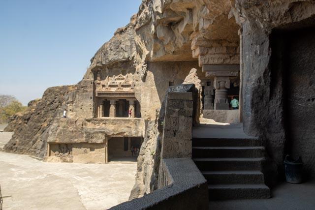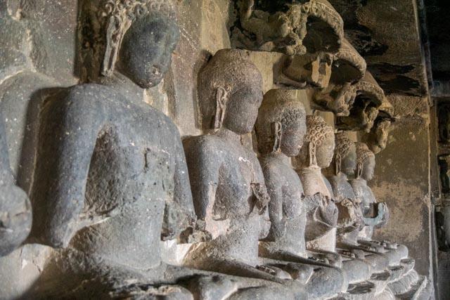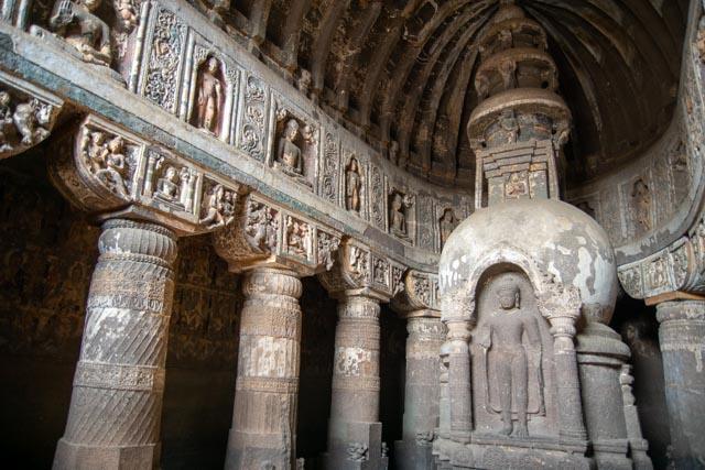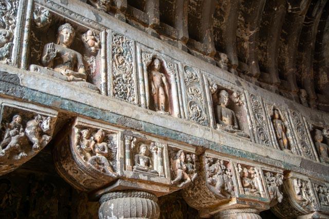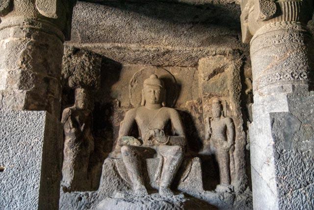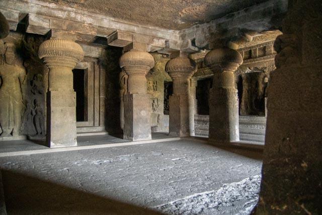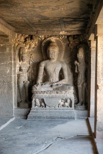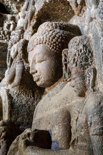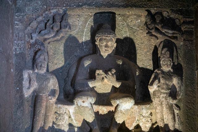 Calm and contemplation infuse the 12 Buddhist caves, which stretch to the south of Kailasa. All are Buddhist viharas (monasteries) were used for study and worship, but these multistoreyed structures also included cooking, living and sleeping areas. The one exception, which is a chaitya (assembly hall). While the earliest caves are simple, Some are more ambitious; both comprise three storeys and are on par with the Hindu Caves.