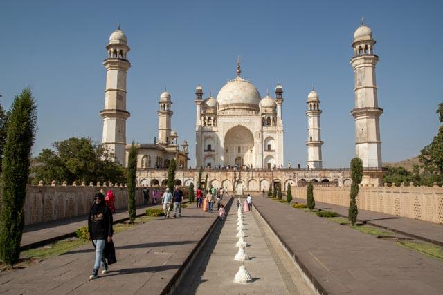 by Aurangzeb’s son Azam Khan in 1679 as a mausoleum for his mother Rabia-ud- Daurani, Bibi-qa-Maqbara is widely known as the poor man’s Taj. With its four minarets flanking a central onion-domed mausole- um, the white structure certainly does bear a striking resemblance to Agra’s Taj Mahal.