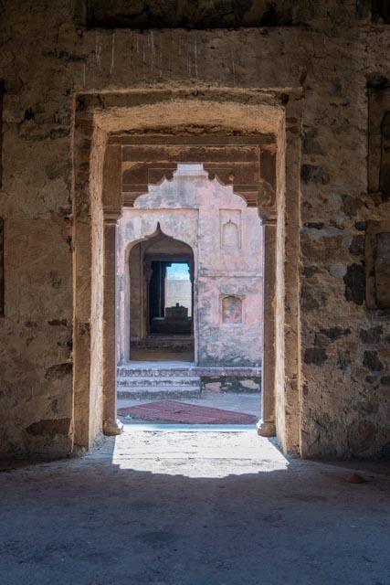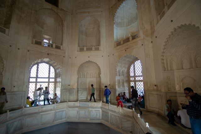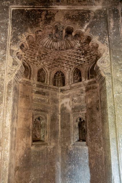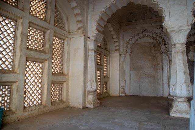 Its walls are crowned by eight domed turrets and eight slender domed pavilions, and superbly devised sightlines carry your gaze through successive arches and doorways to jali screens with views over the countryside or town around.