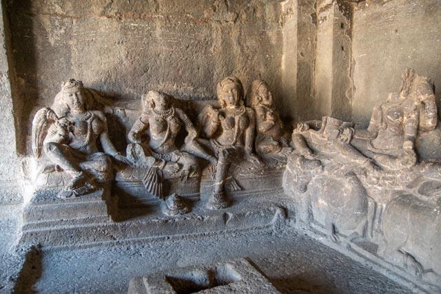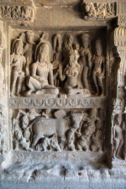 One of India’s greatest monuments, this astonishing temple, carved from solid rock, was built by King Krishna I in AD 760 to represent Mt Kailasa (Kailash), Shiva’s Hialayan abode. To say that the assignment was daring would be an understatement. Three huge trenches were bored into the sheer cliff face, a process that entailed removing 200,000 tonnes of rock by hammer and chisel, before the temple could begin to take shape and its remarkable sculptural decoration could be added.