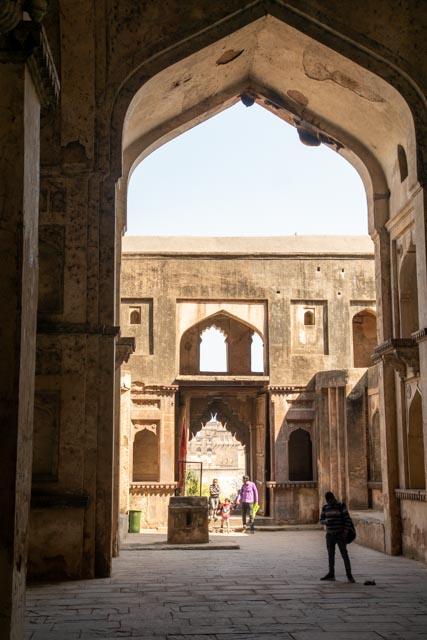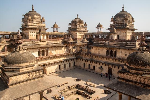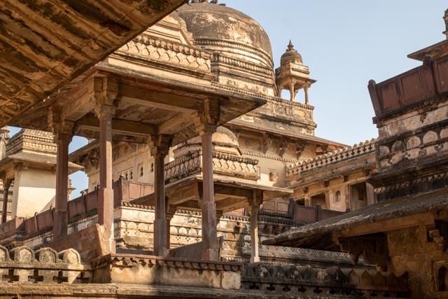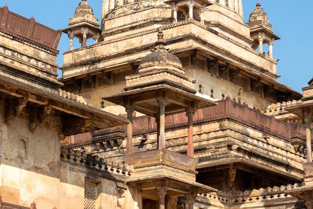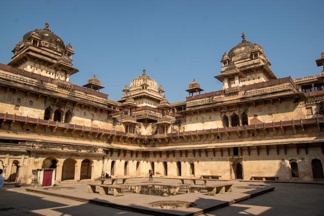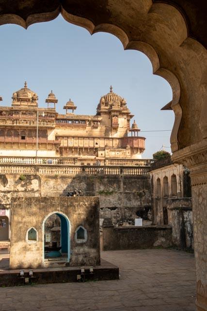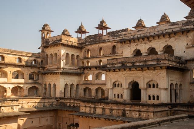 Instead I continued to The massive Jehangir Mahal (Ochhra fort), an assault course of steep staircases and precipitous walkways, represents a zenith of Indo-Islamic architecture. More decorative than the Raj Mahal next door , it was built, or at least completed, in the early 17th century by Bir Singh Deo, possibly for a visit by emperor Jehangir.