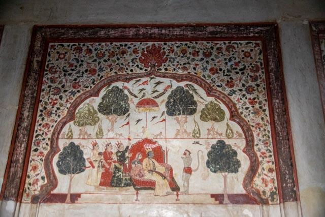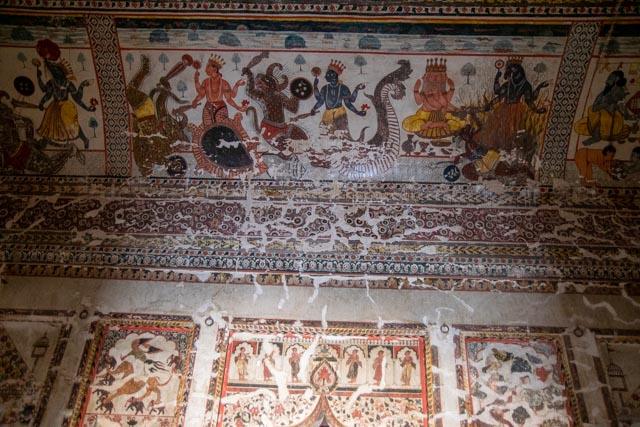 Besides the fort was the 16th-century Raj Mahal, in several rooms deities such as Brahma, Vishnu, Rama, Krishna and Sita, plus Orchha royalty, wrestle, hunt, fight and dance their way across walls and ceilings in vivid, colourful murals. Unfortunately some of them had severely faded.