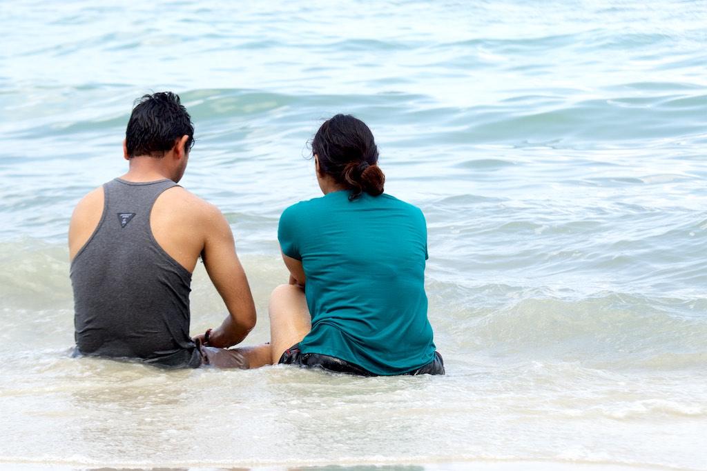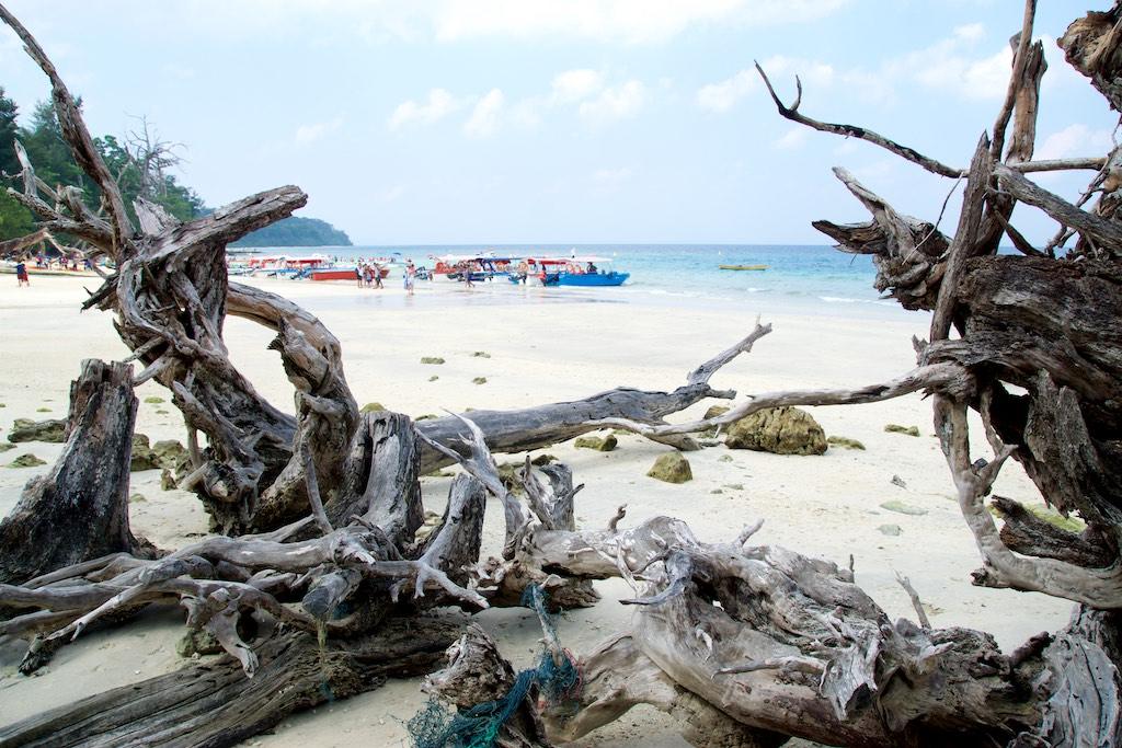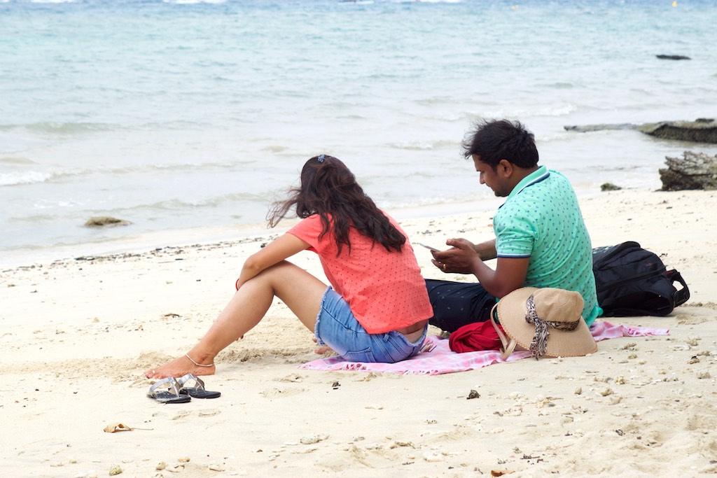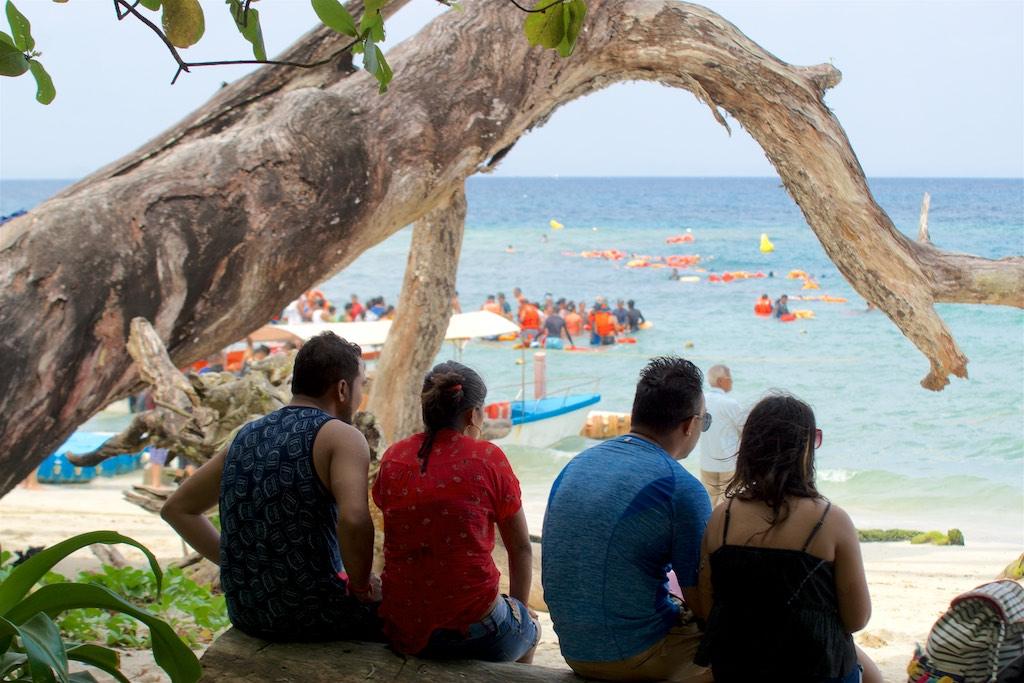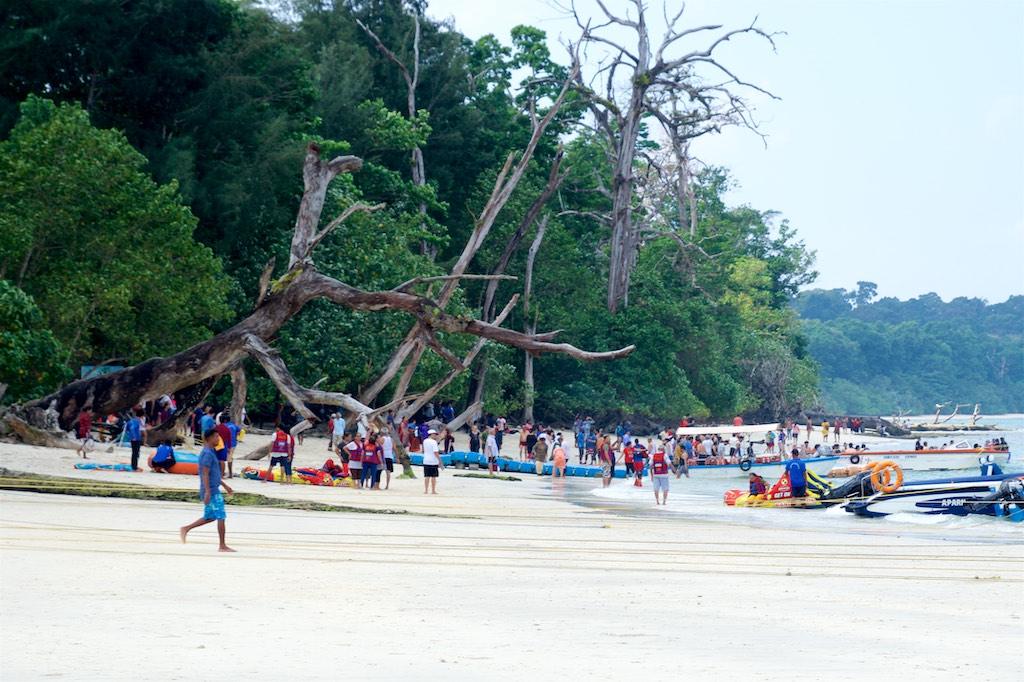 Finally I arrived at the mangroves from where I could see the beach. A bit further on a large group of Indians, who based on the number of boats anchored at the shore, all had chosen the easy way to the beach, were amusing themselves. There was a wonderful and exciting vibe in the crowd. Fruit sellers were trying to catch attention of potential customers, other stalls were promoting underwater walks and I even saw two jetski’s. The atmosphere was happy and everyone was enjoying themselves but my eye was attracted by a long stretch of white beach that seemed to be untouched.