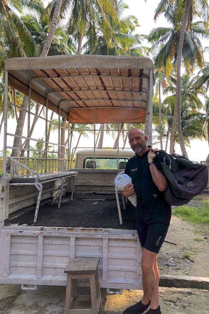 Next morning the alarm went off at 5 o’clock so I could shower at ease. A rickshaw was already waiting for me and brought me to the second jetty at the harbour. There I met the dive crew and not much later Mitch, the dive master arrived. The boat was loaded and we changed at the jetty after we headed off at the dive site.