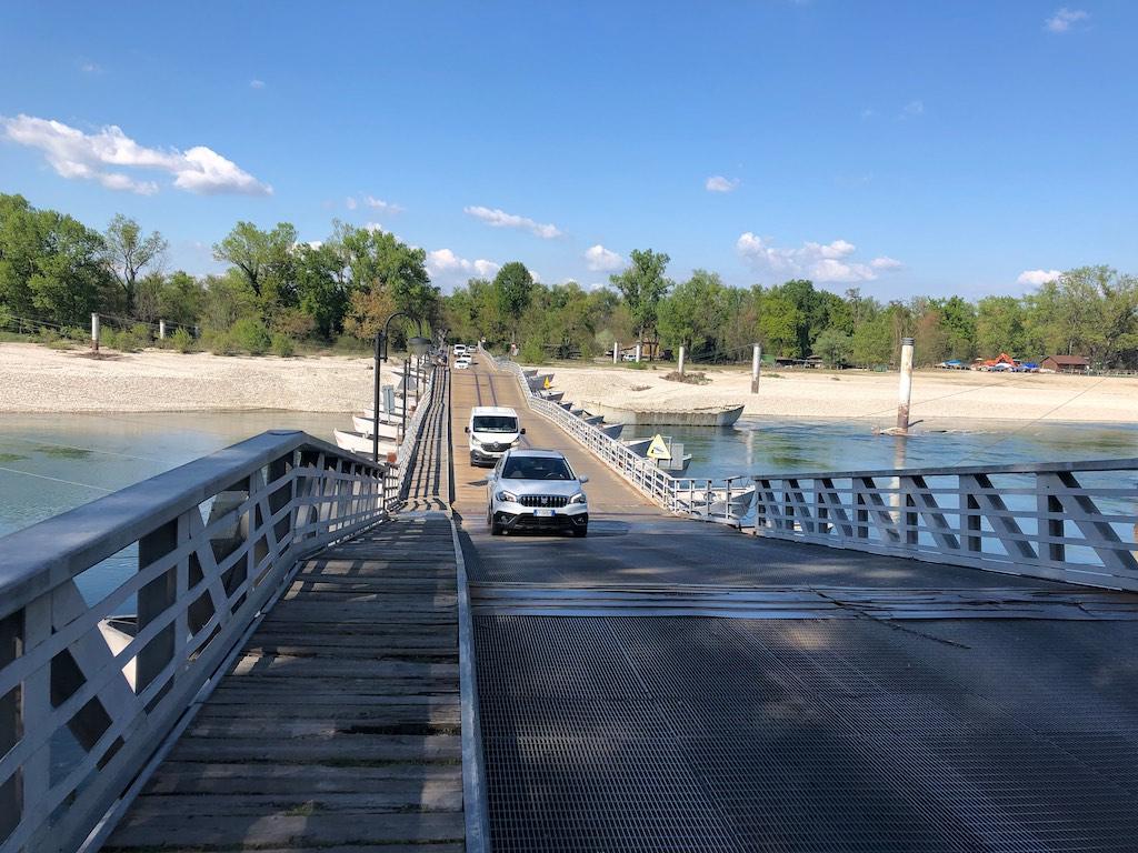 Next day we first visited Ponte delle Barche in Bereguardo. It was built in 1931 as a provisional bridge, but it lasted till now. The barges that now sustain the bridge are made of cement, but the original were made of wood. The bridge follows the river load, it rises with the water level. Next to it was a lovely terrace, a good excuse for a glass of prosecco.