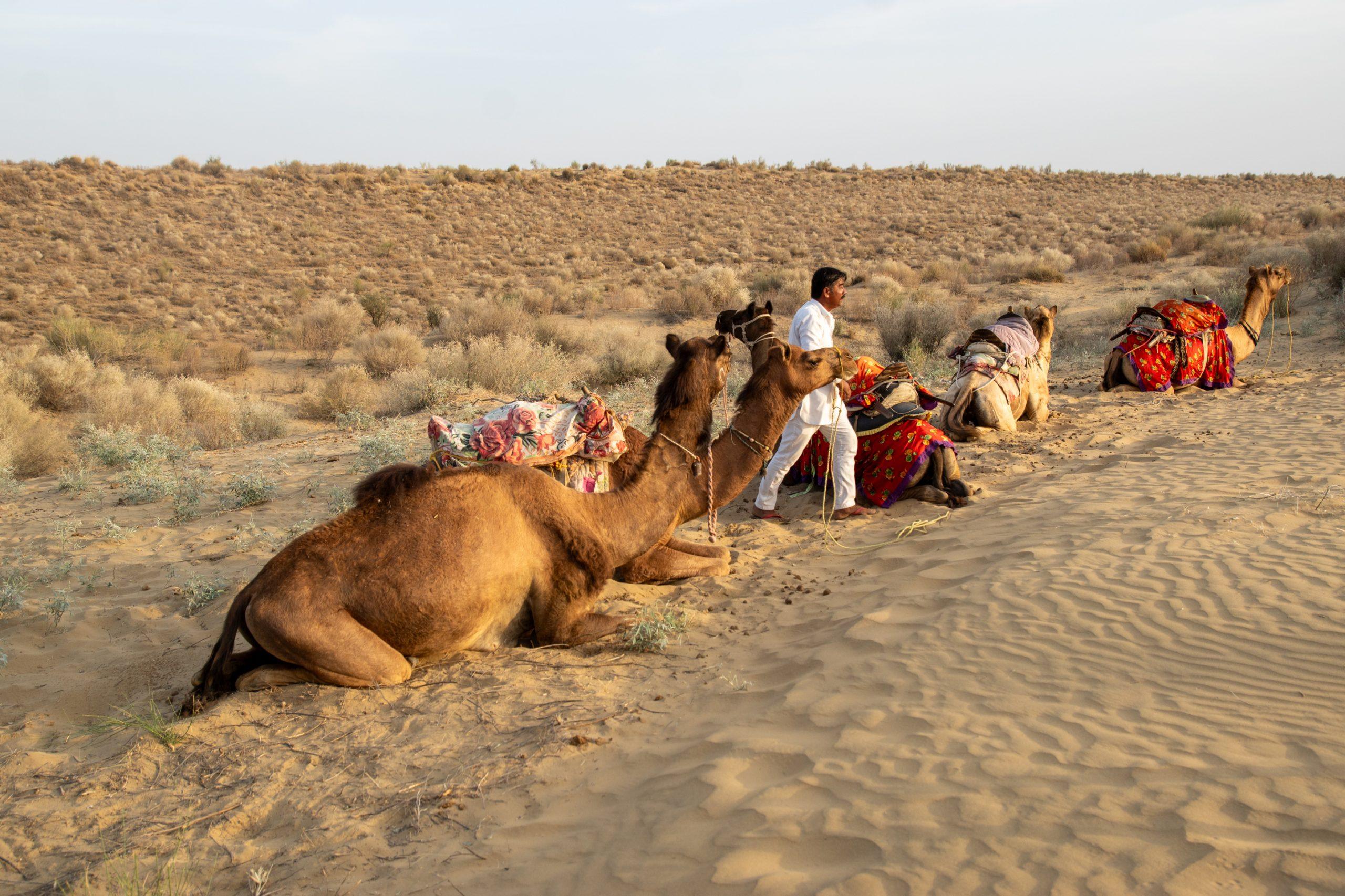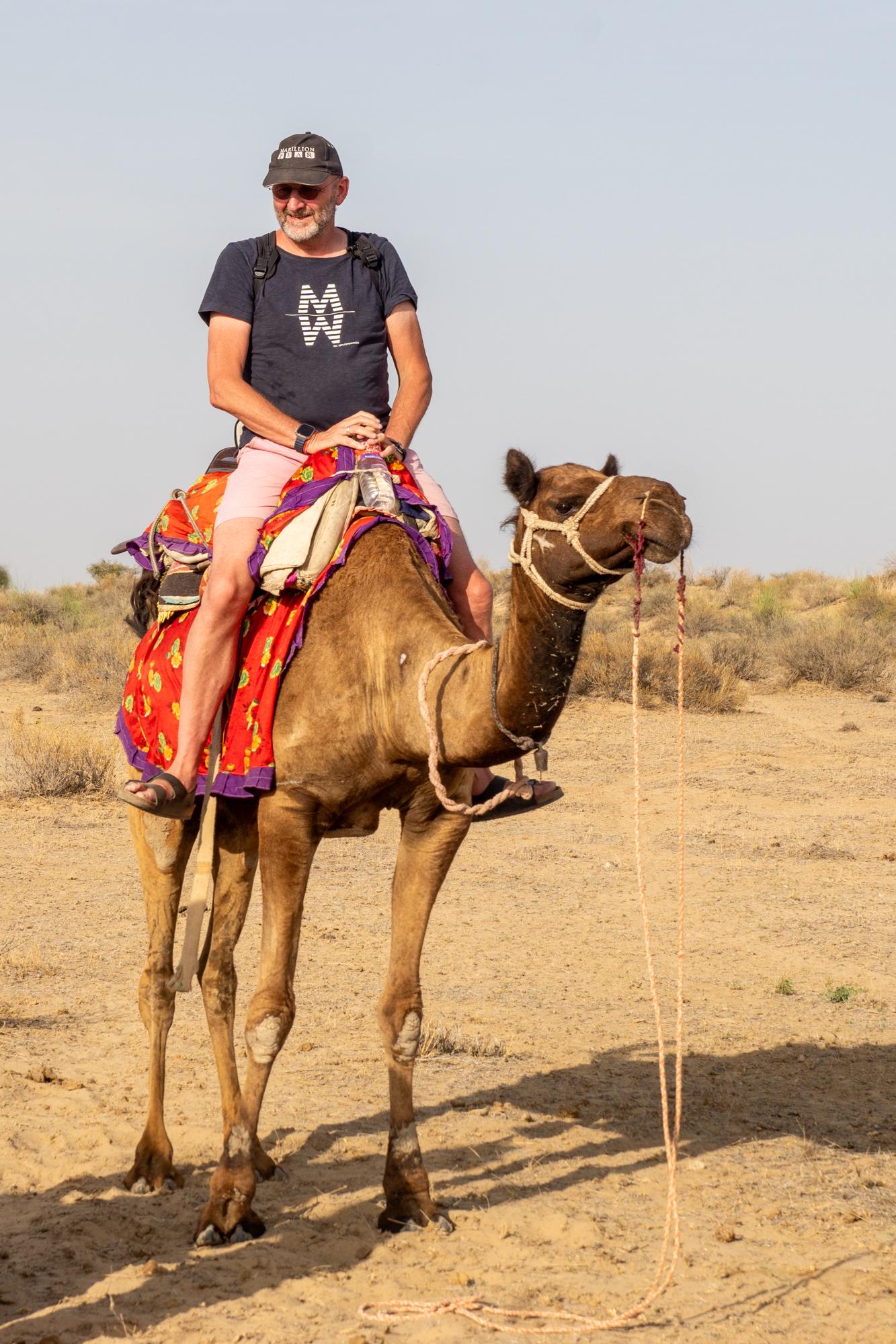 One hour later we arrived at the spot where the camel driver was waiting for us. My camel was a bit irritated at first but fortunately his driver kept him under control so I could enjoy the ride. It was a rather uncomfortable drive, at least if you are not used to it, but one hour later we arrived at our overnight camp in the Thar desert, on top of some lovely sand dunes.