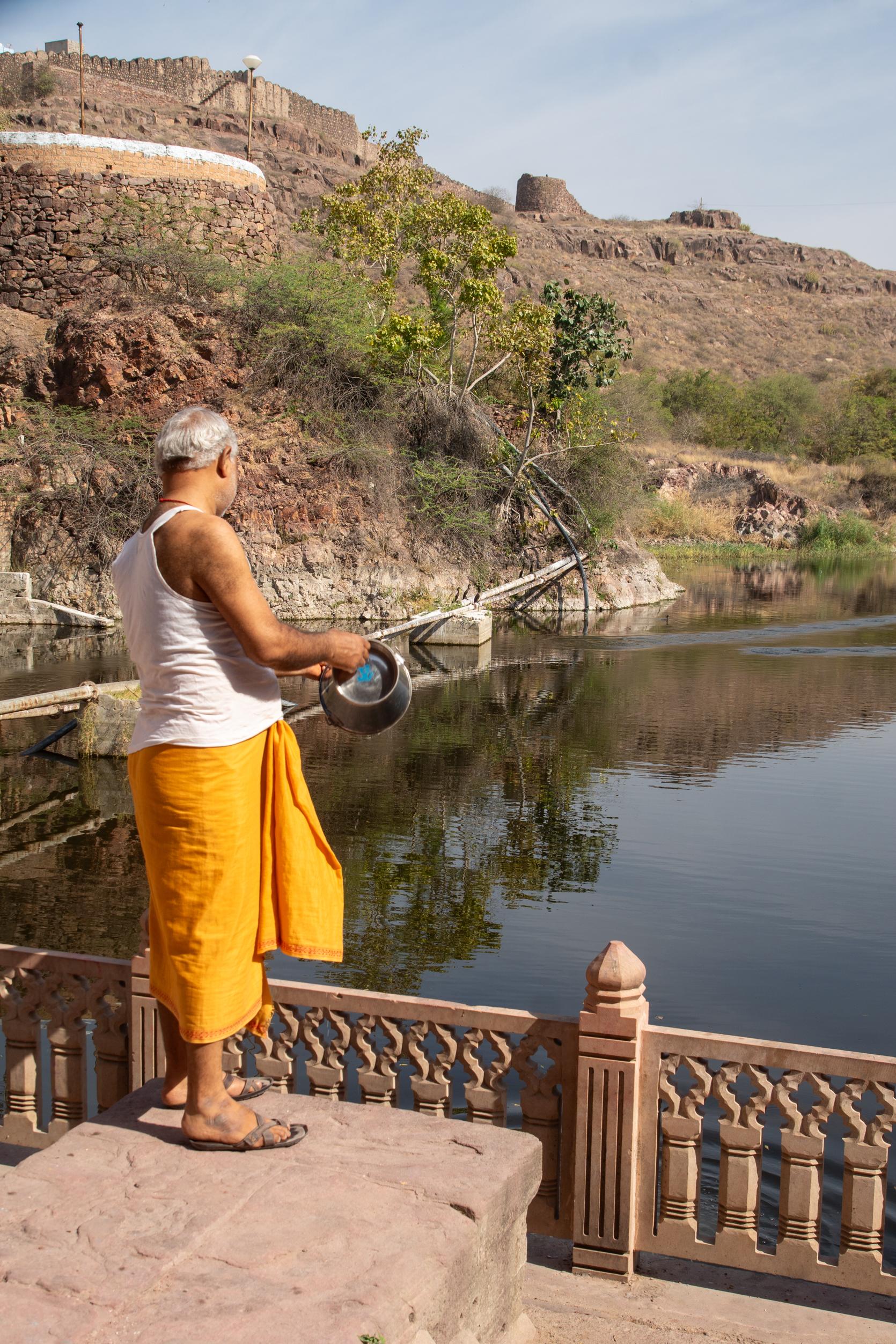There was one thing in Jaisalmer that I had not seen yet which was the Gadisagar Lake. This rainwater reservoir, built in 1367, was once the city’s sole source of water and is lined with ghats and temples. The gateway leading to the tank was built by a royal courtesan, Telia, whose audacity so enraged the queens that they demanded its demolition. The quick-witted Telia had a statue of Krishna installed on top, thereby ensuring that the gateway would stand.